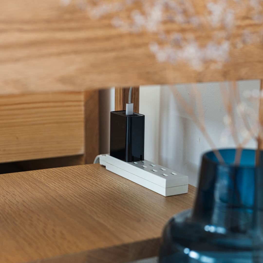 下の棚にはコンセントタップや小物などを置くのに便利です。