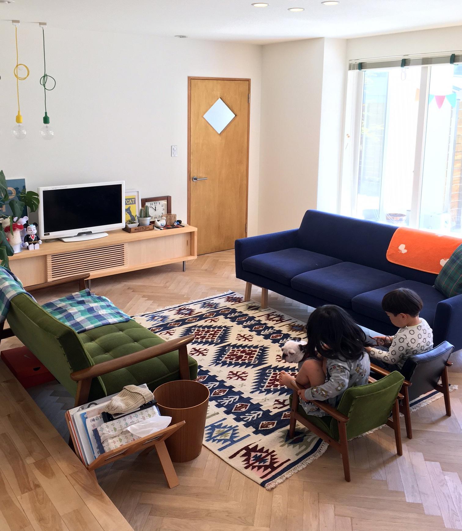 お子様もわんちゃんもいらっしゃって、本当に可愛いです. カリモク60のキッズソファに座る姿が微笑ましいです。 フロートソファ は、カバーリングになりますので、汚れてしまってもクリーニングが可能です。 お子様やペットのいらっしゃるご家庭でも安心ですね!