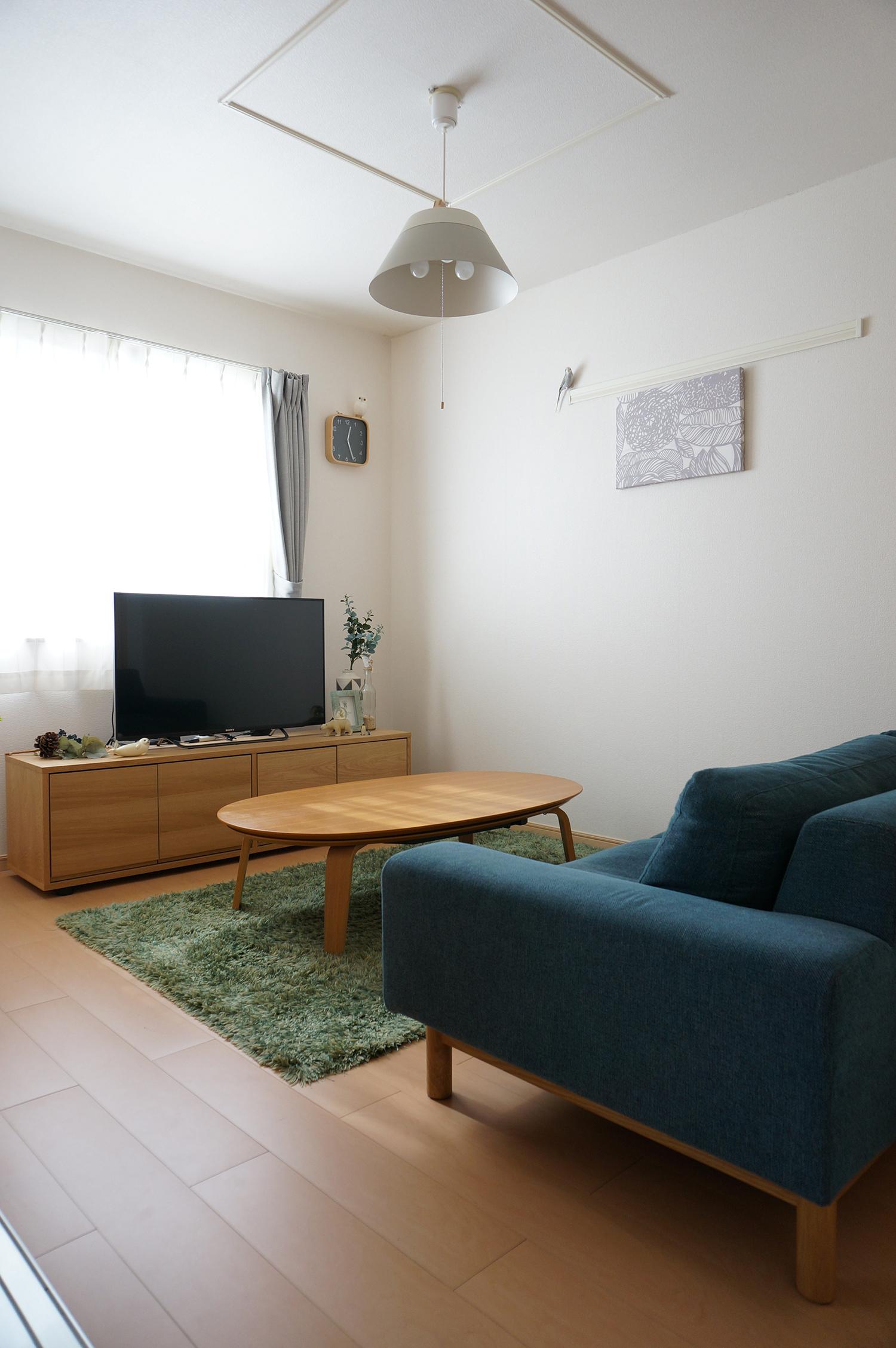 ホワイトとナチュラルの淡く優しい空間にグリーンのラグでさらにナチュラルな印象に。太陽の日が差し込むとっても明るい空間です。