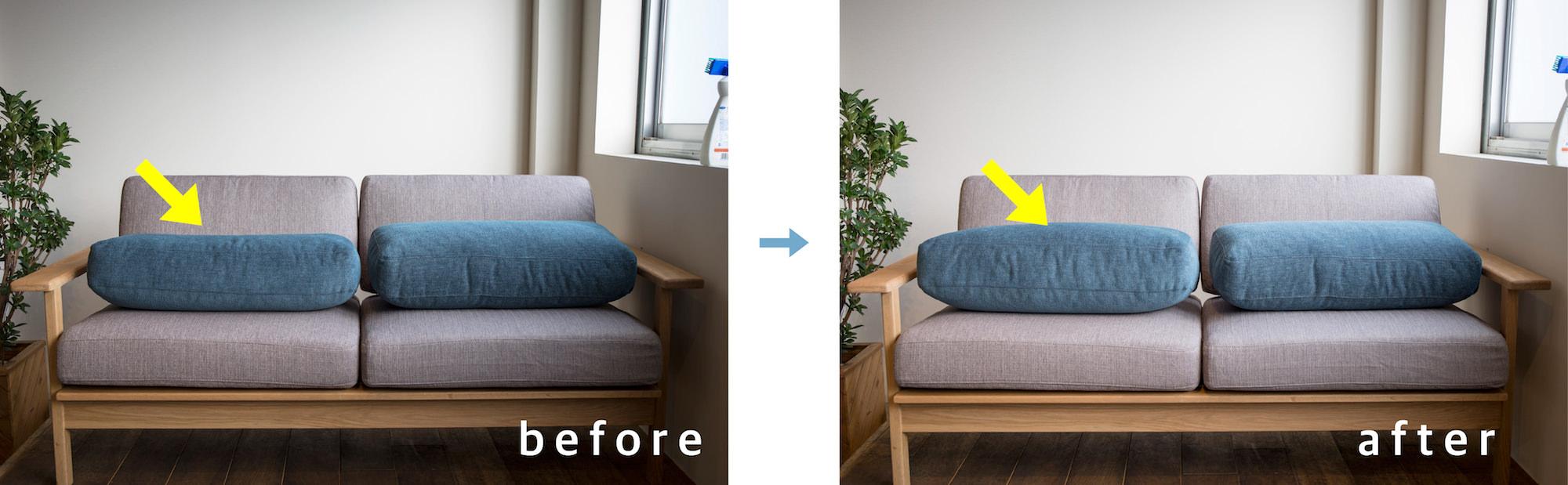フェザークッションは、身体をふわっと包み込むような座り心地が特徴で、SIEVEのソファではバージュソファ、レクトユニットソファなどで使用しております。フェザーは柔らかな天然素材なので、座った場所のクッションが型崩れしやすいという特性もあります。しかし、少し手を加えるだけで元のような形に戻すことができるのも特徴です。