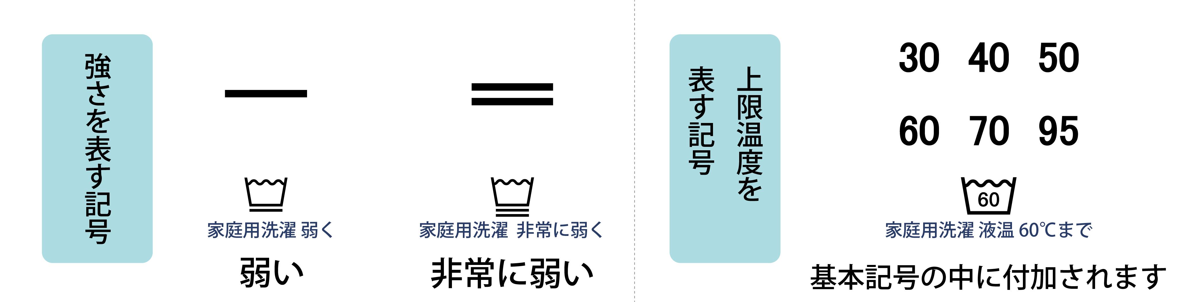 上記の『基本記号』に『温度や強さ』等を表す『数字や記号』を加わえる記号を付加記号と言います。洗濯表示マークは、5つの『基本記号』 + 『付加記号 』の組み合わせでできています。