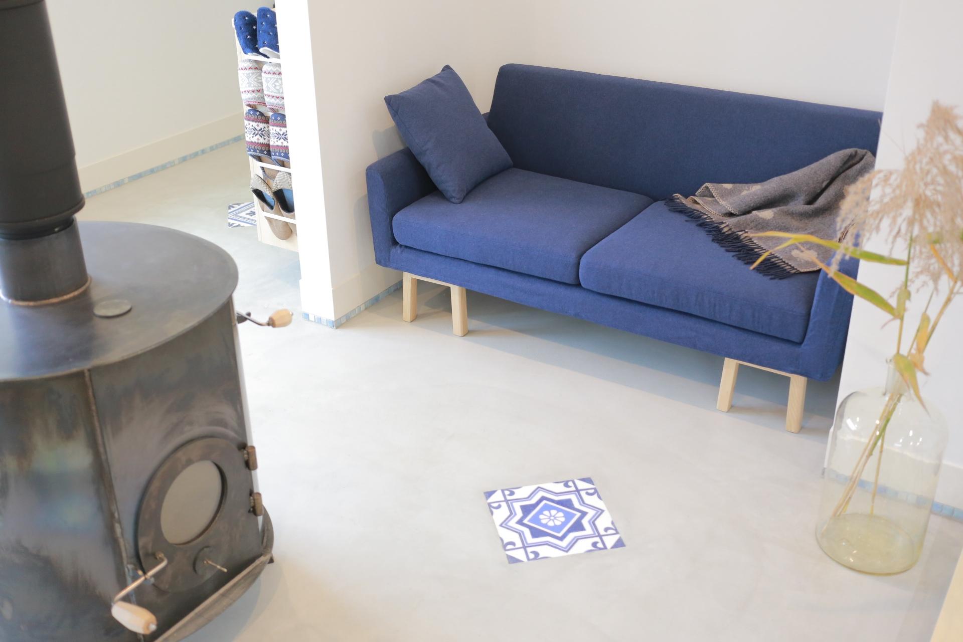 フロートソファやタイルなど、ブルー色をアクセントに全体のバランスを整えた空間。