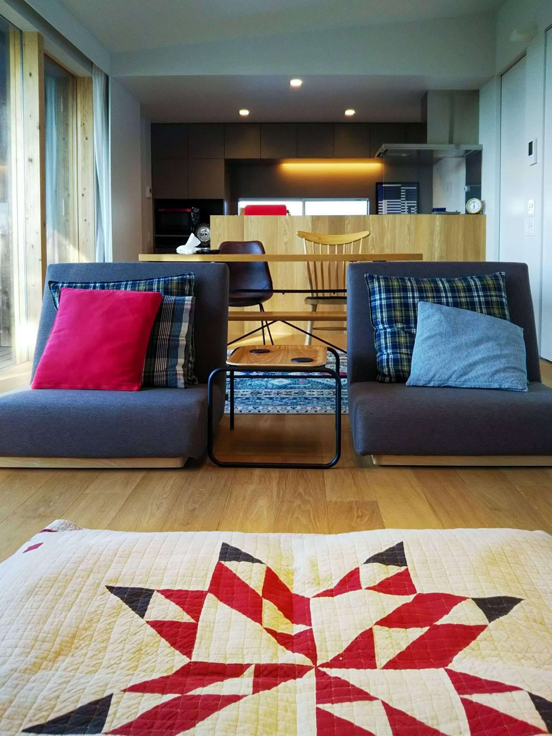 全体のバランスを見てソファの色は2台とも揃え、クッションやラグなど小物でアクセントをつけられています。