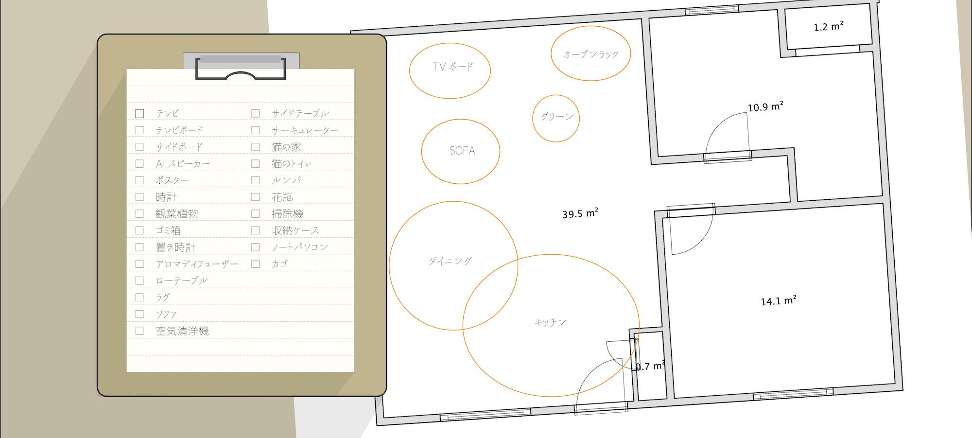 家具の大きさと通路の広さを計算し、必要なサイズの家具を配置できる間取りを考えます。