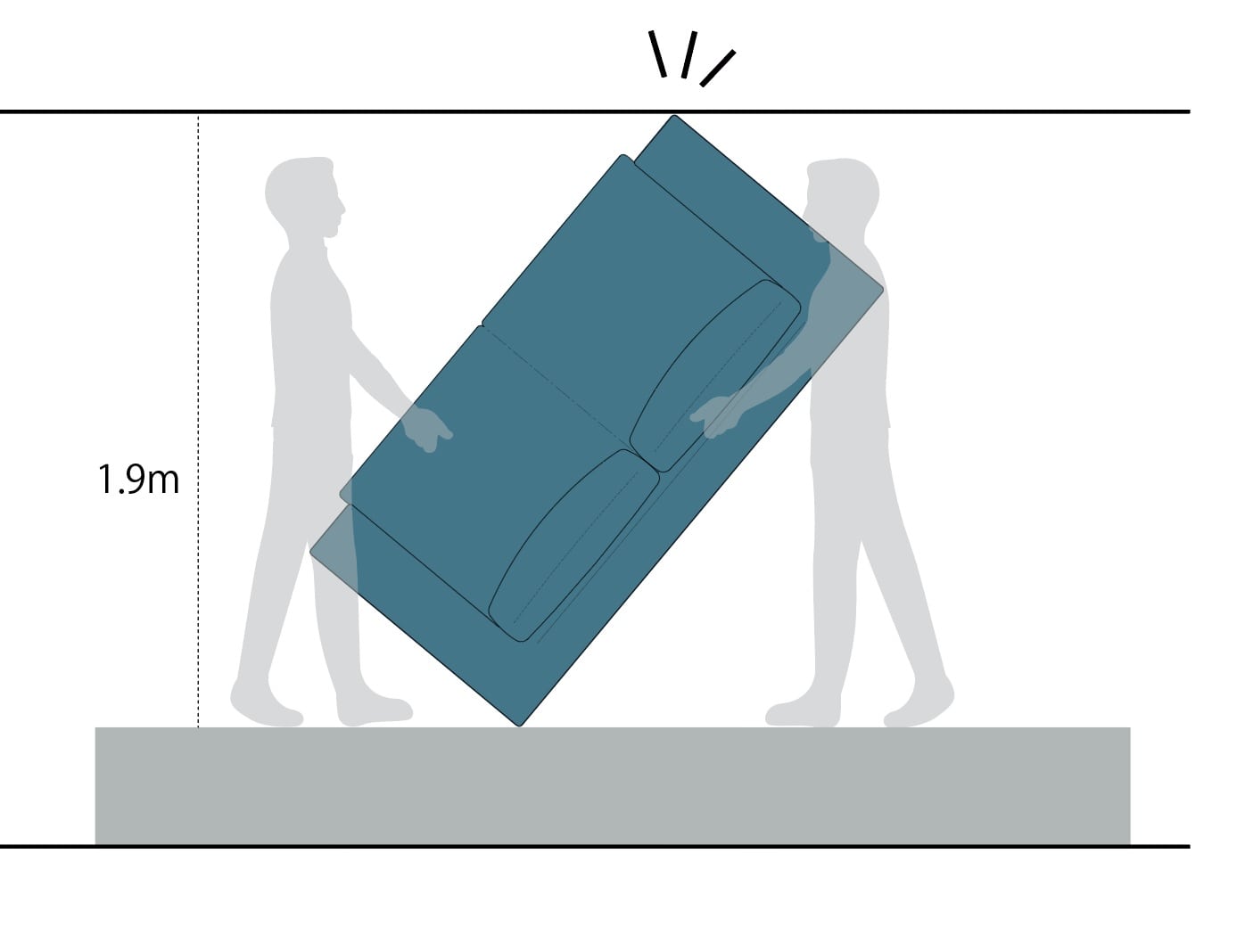 ソファのような大型商品を搬入する場合、横長の状態では通路の曲がり角を通る事が出来ない為、イラストのように立てて運びます。