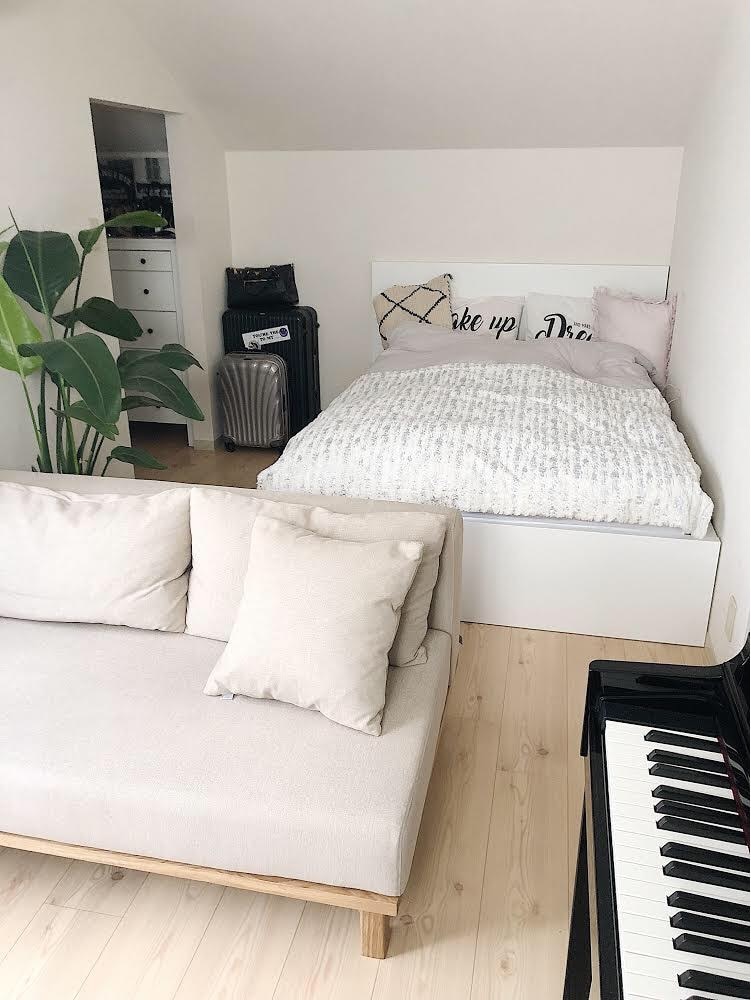 "ソファの横には趣味でローランドのピアノを置いています。8畳程度の寝室にベッド、ソファ、ピアノを配置できたのはこのソファだからこそ!ちなみに、沈み込まない硬めなソファなので、だらーっとしすぎちゃわないところがお気に入り。"