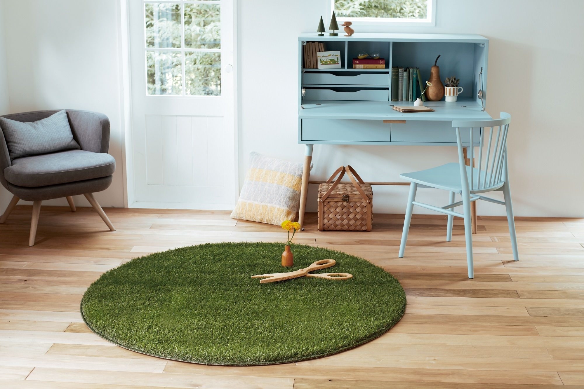 壁は白、机と椅子にはパステル調の水色を配置しました。床のラグにはモスグリーンを採用することで落ち着きが出ています。