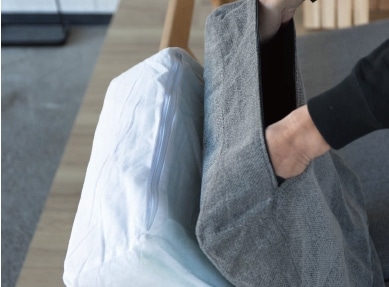 カバーの向きを確認し、均等にカバーを差し込みます。クッションを折り曲げるのが難しいようであれば、床に傷がつかないようラグなどを敷き、軽く体重をかけて曲げる方法もございます。