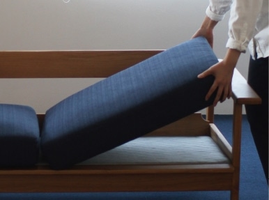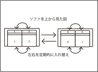 いつもソファの同じ位置に座り続けると、その部分だけウレタンのへたりが早く出やすくなります。座る位置を変えたり、定期的にクッションの左右位置を交換させることでソファのへたりを軽減し長くご愛用を頂けます。