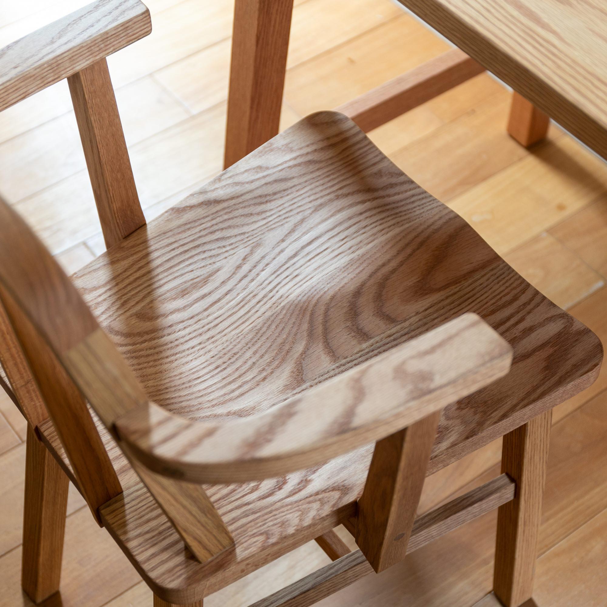 ダイニングチェア、ダイニングアームチェア、ダイニングハイバックベンチは、座面がお尻にフィットするように板を削り込む『座ぐり』を施しました。
