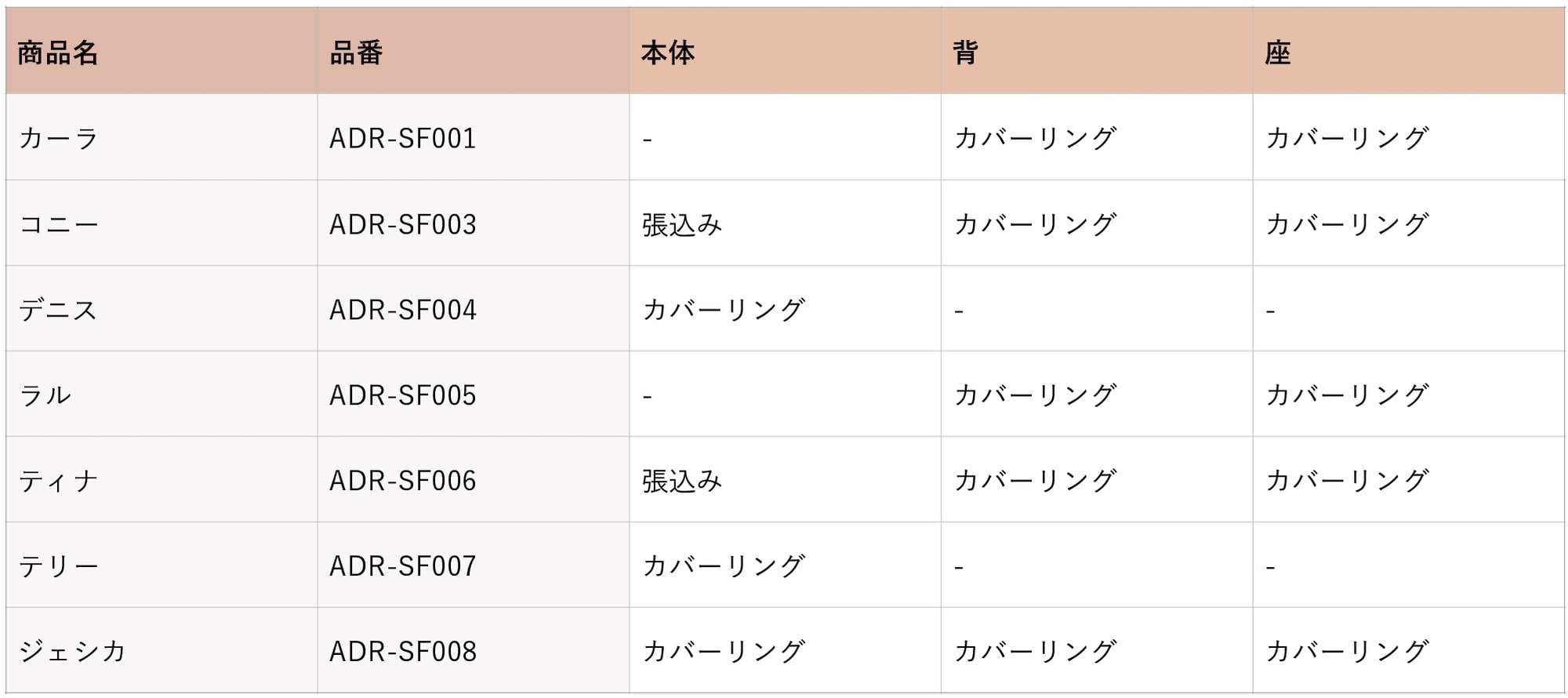 SIEVE ADRS ソファカバー脱着可否の一覧表です