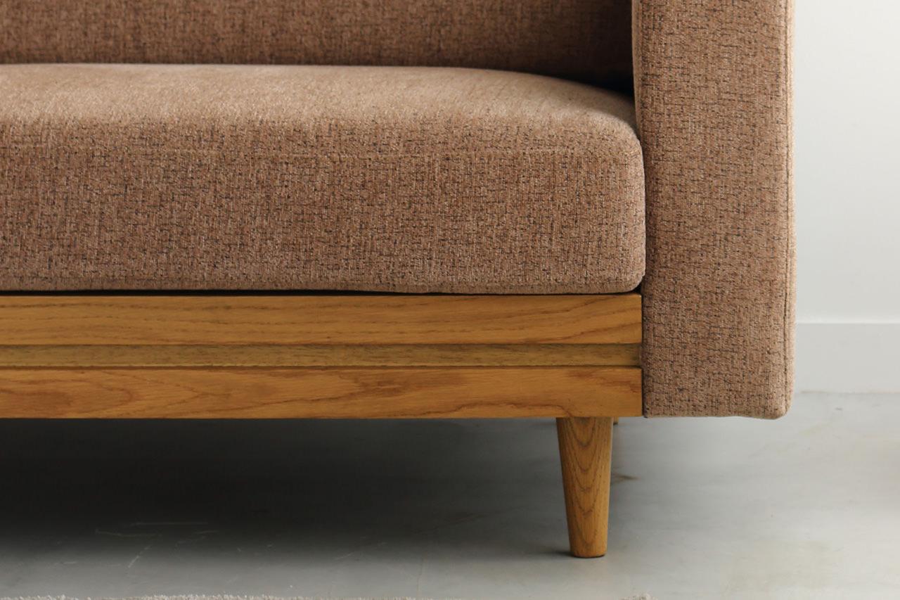 座面下に広く取った木部に、一本のラインを施したデザインが目をひくポイントになっているティナソファ。