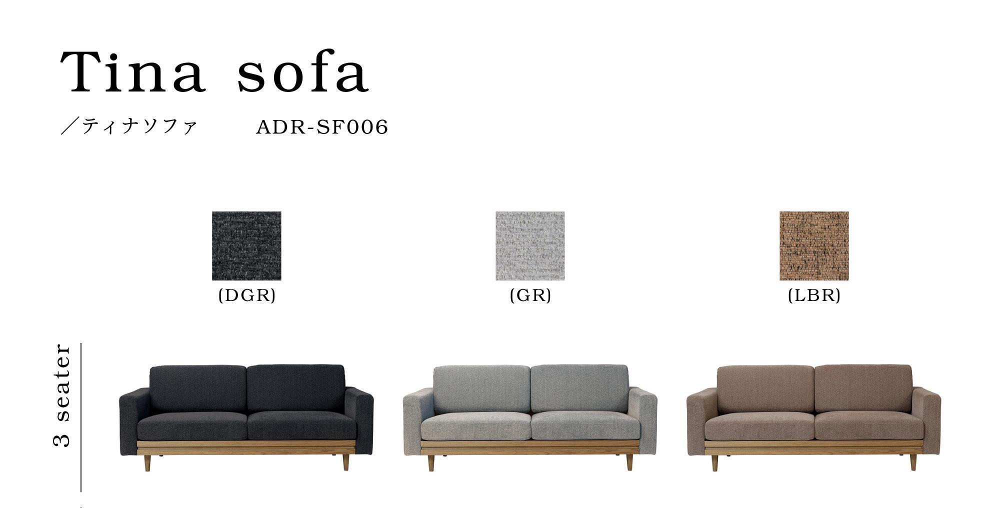 ティナソファのカラーは、ダークグレー[DGR]、グレー[GR]、ライトブラウン[LBR]の3種類。
