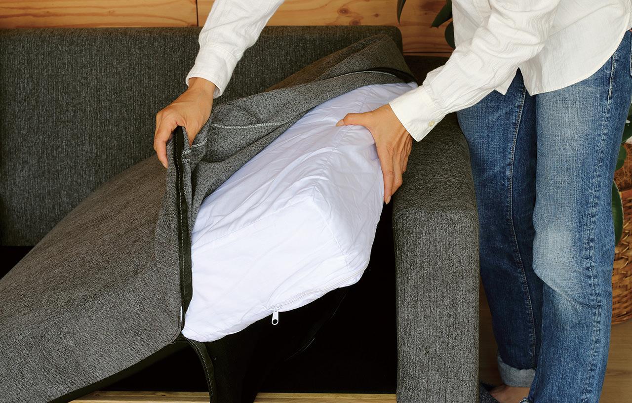 カバーはファスナーで取り外すことができ、ドライクリーニングでお手入れしていただけるので、汚してしまった時にも安心です。