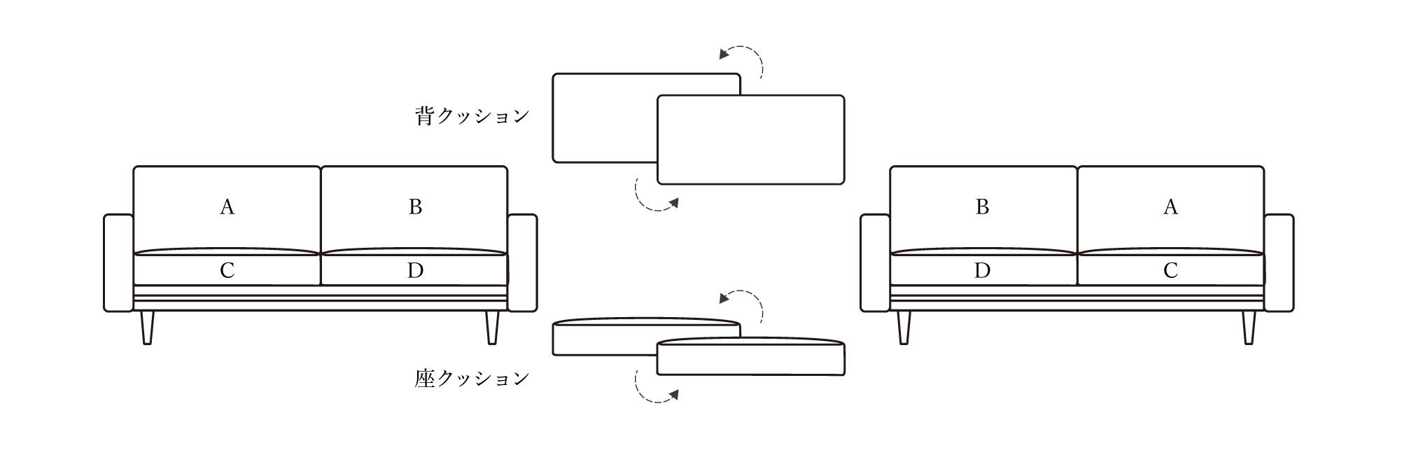 いつも同じ位置に座っていると、他と比べ早く消耗してしまうため、背クッション・座クッションそれぞれの左右を入れ替えることで負荷を分散し、良い座り心地が長持ちさせられます。