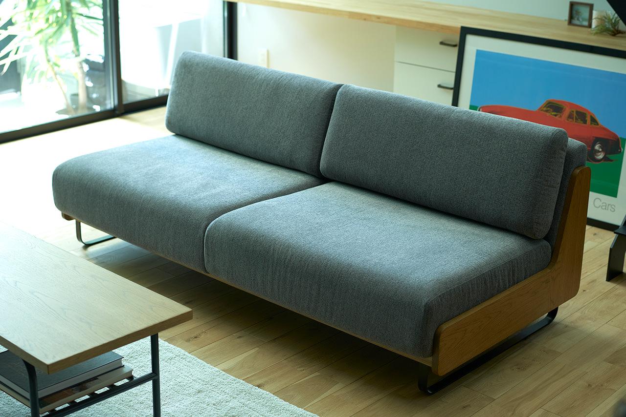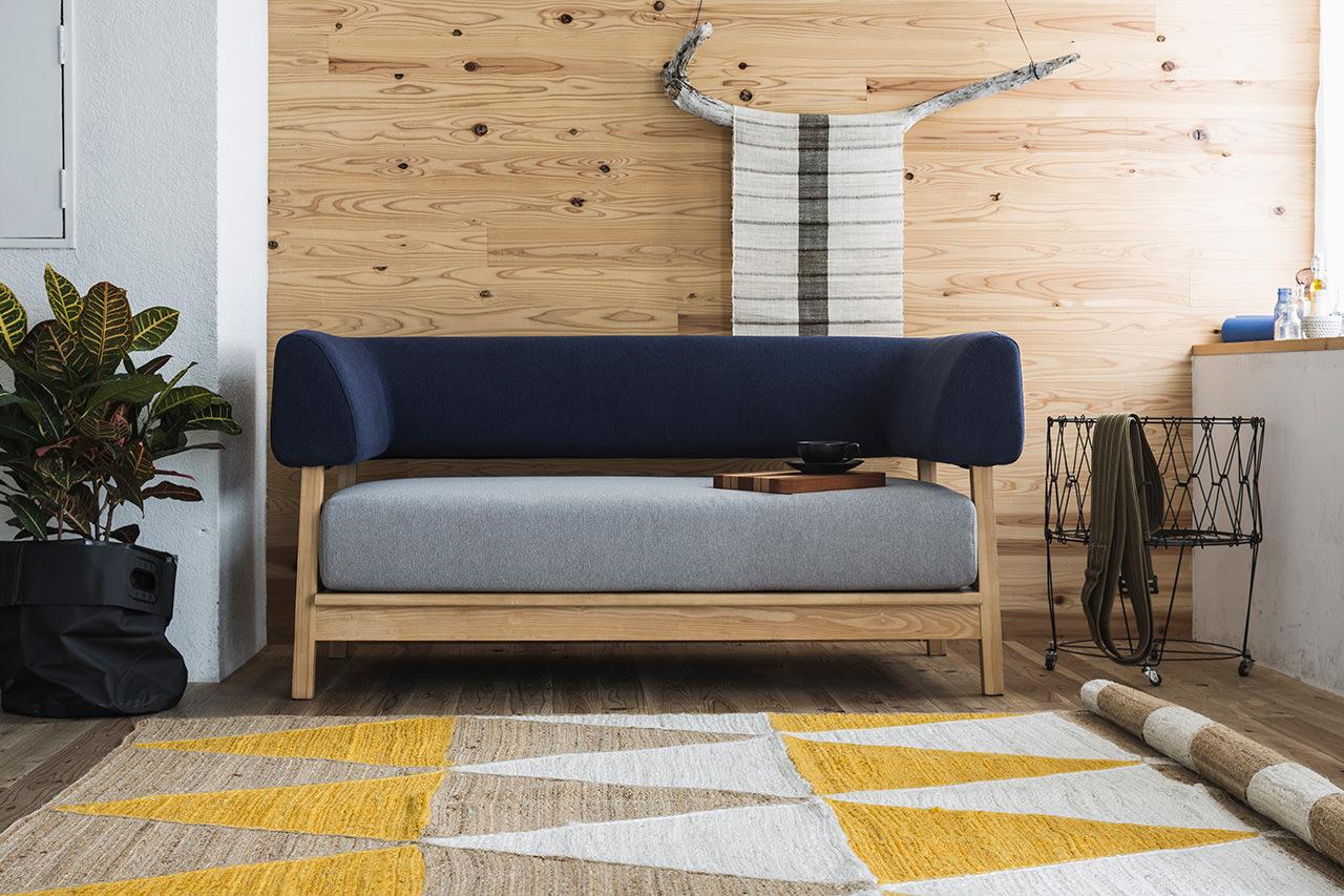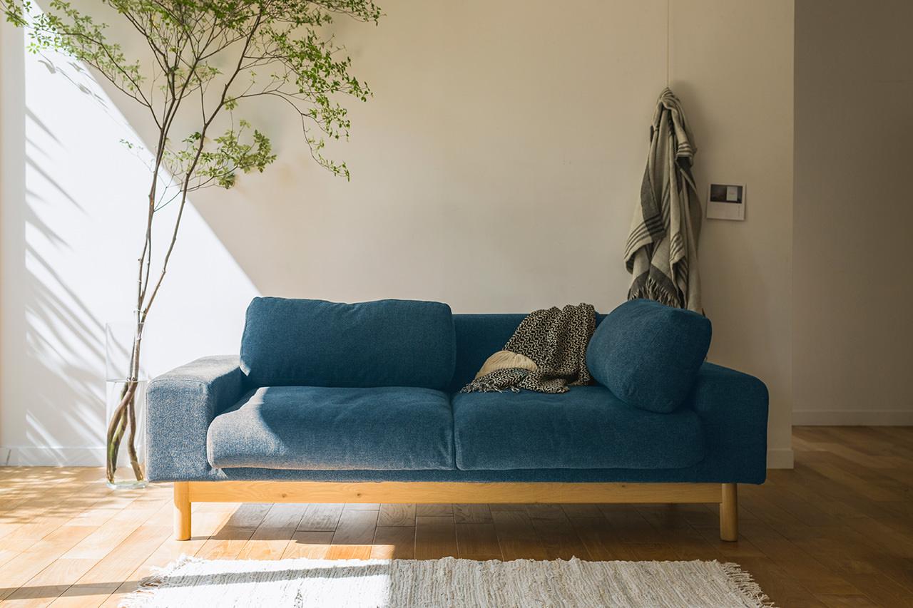 シンプルで凛としたデザインと、天然木のフレーム。そして少し粗め生地を組み合わせた、どことなく懐かしい雰囲気のソファです。