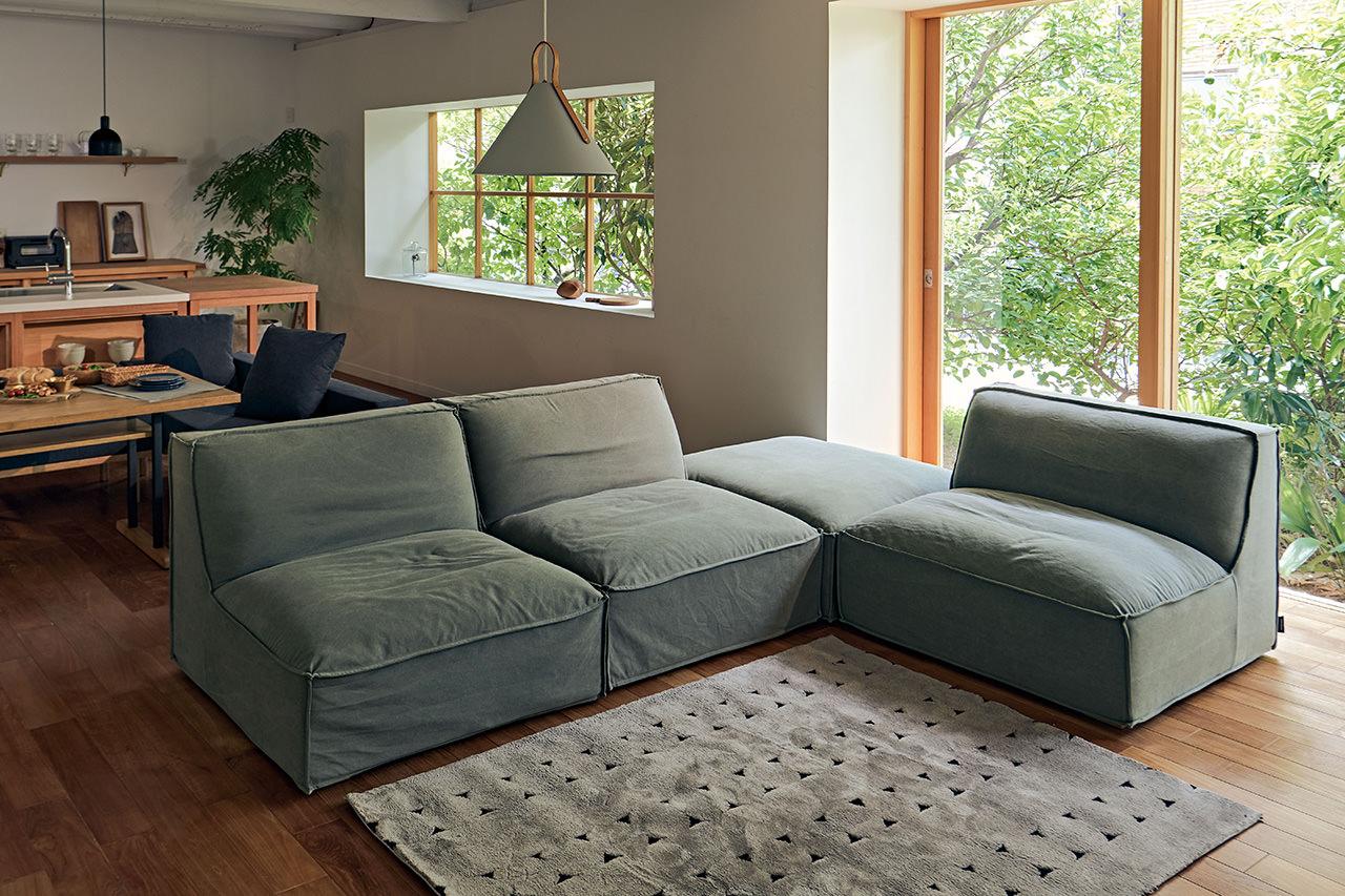 4つのアイテムすべての座クッションのサイズを合わせたことで、様々な組み合わせが可能なスナグユニットソファ。