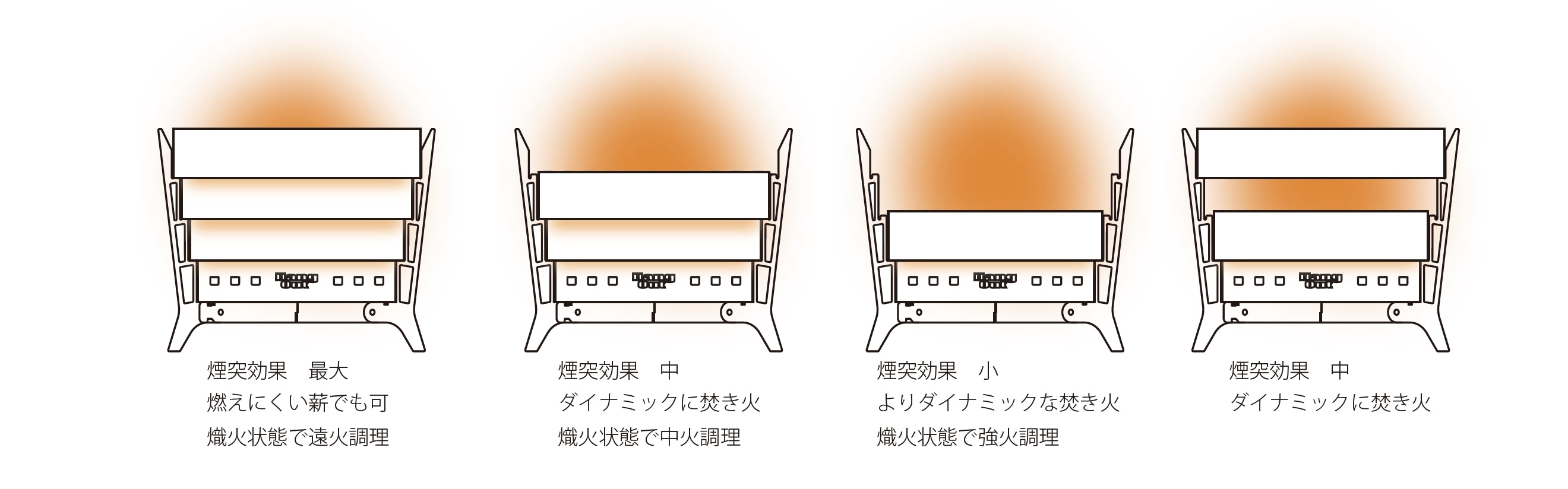 冷たい空気を下から吸い上げて上昇させる力で、空気の対流を促進させ燃焼効率化が格段に上がります。