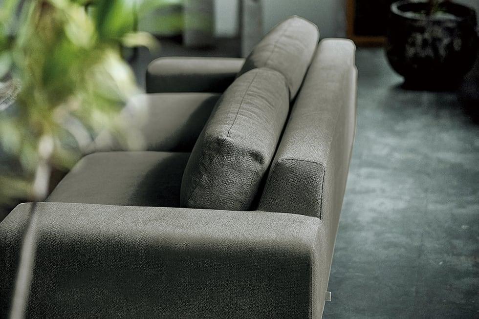 バージュソファの特徴の一つに、すっきりとしたデザインがあります。 「背クッション」や「肘かけ」にボリュームを持たせ、すっきりとした中にも安定感のある雰囲気を目指しました。