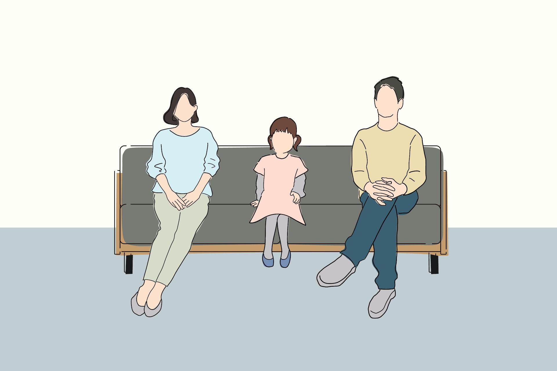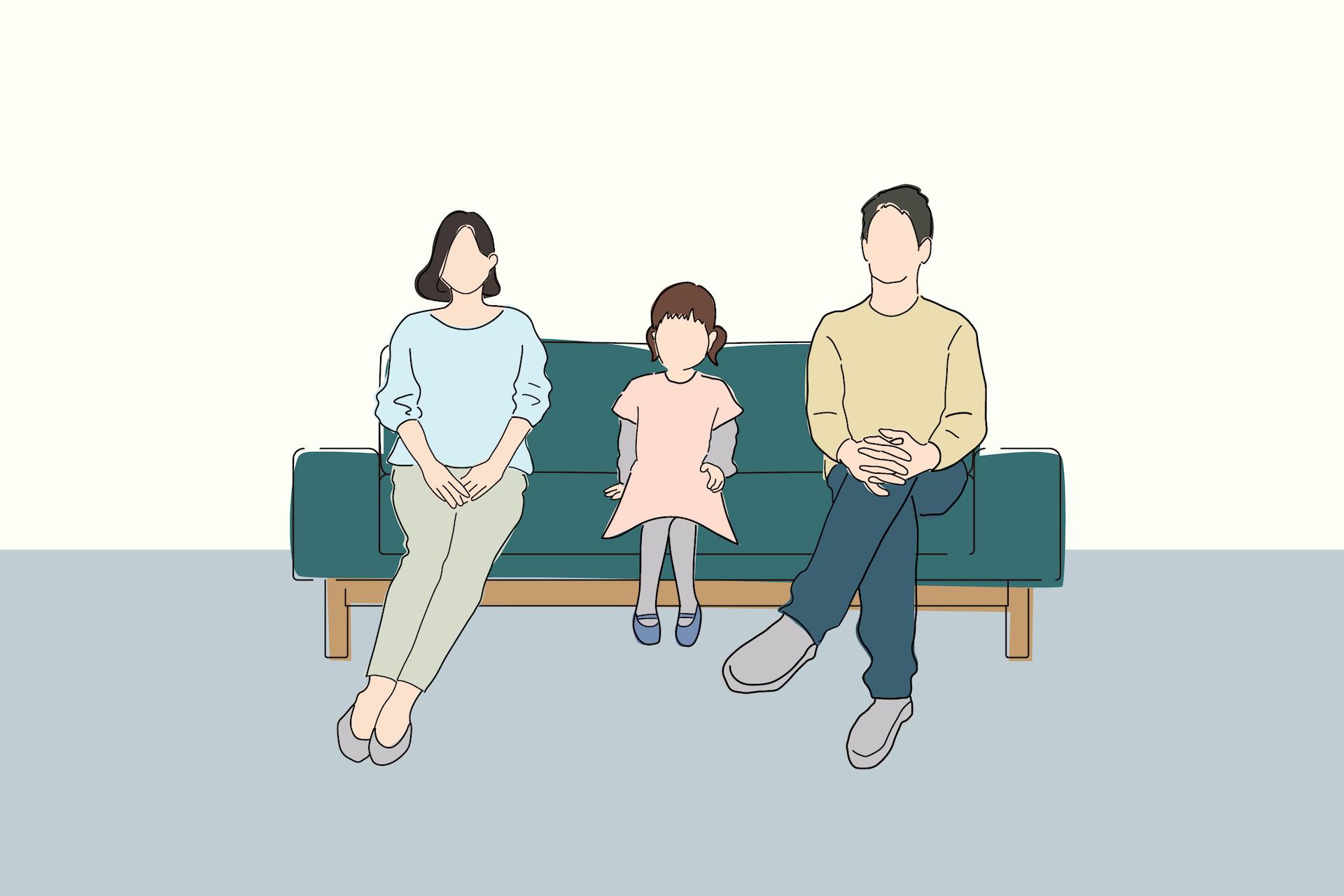 バージュソファ2人掛けは、座クッションの横幅が140cmありますので、座り方や体型にもよりますが、イラストのように「大人2人+子供1人」でも座れるサイズです。