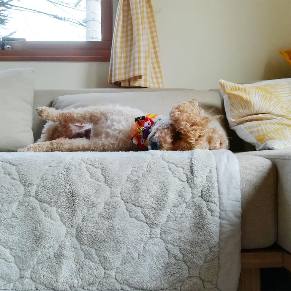 "ソファがお気に入り過ぎて… うちのワンコが汚さないようにスローケットを敷いて使っています。"