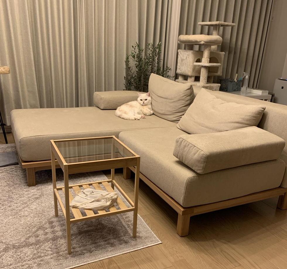 "猫もお気に入りで、いつもソファで寝ています。こちらのソファは猫が引っ掻いて傷ができてもカバーだけ交換できるためそこも決め手でした!"