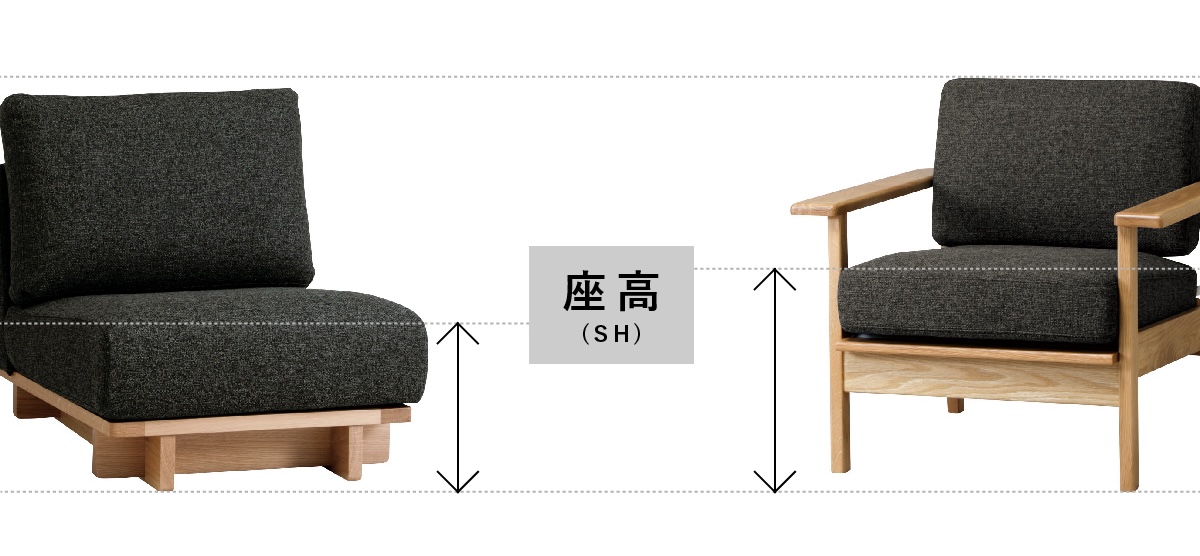 一般的なソファの座の高さ(SH)は、40cm前後に対して、ローソファの座の高さは、35cm以下と低めに設定されています。