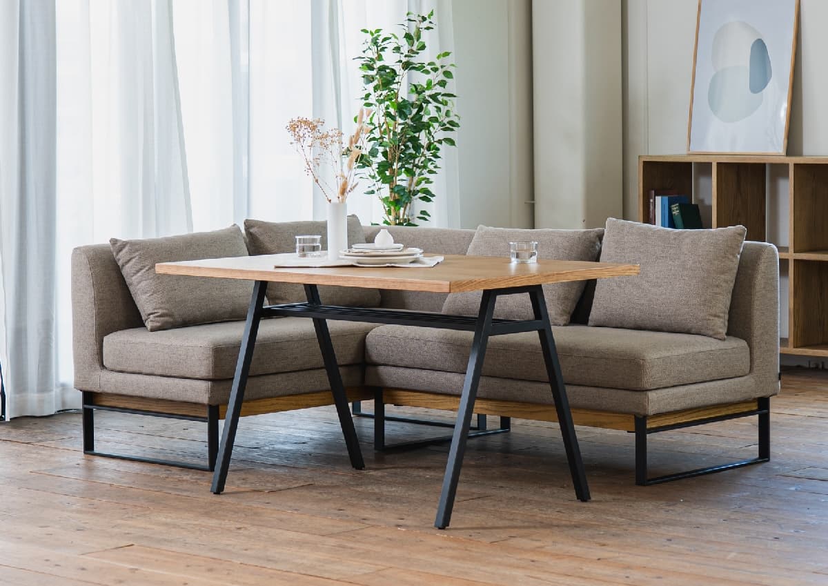 幅120 × 奥行き80(cm)のダイニングテーブルと、コーナーソファを組み合わせたダイニングソファセットです。