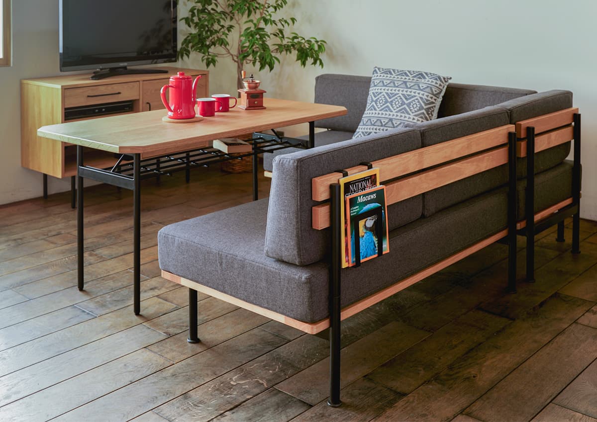 鉄のフレームとソファ背板のオーク無垢材が映えるデザインで、ナチュラルな雰囲気からクールな雰囲気のお部屋にも合わせやすいデザインです。