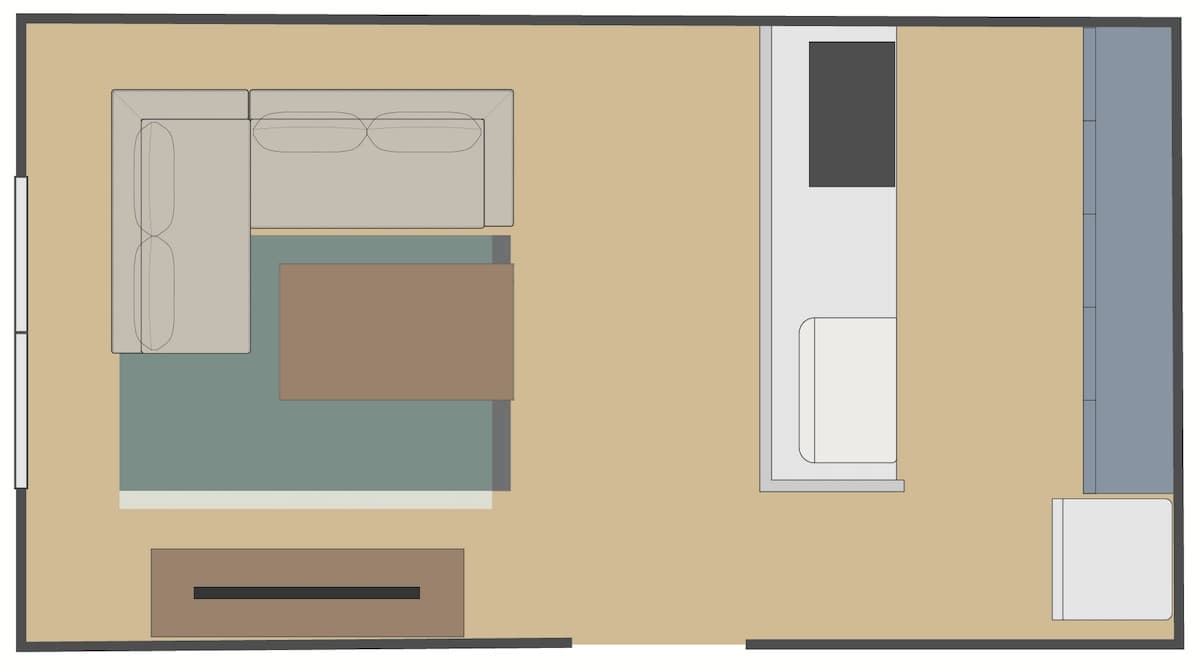 ソファとダイニングを置いた場合、生活動線となる通路のサイズが狭く、窮屈な印象がありますが、
