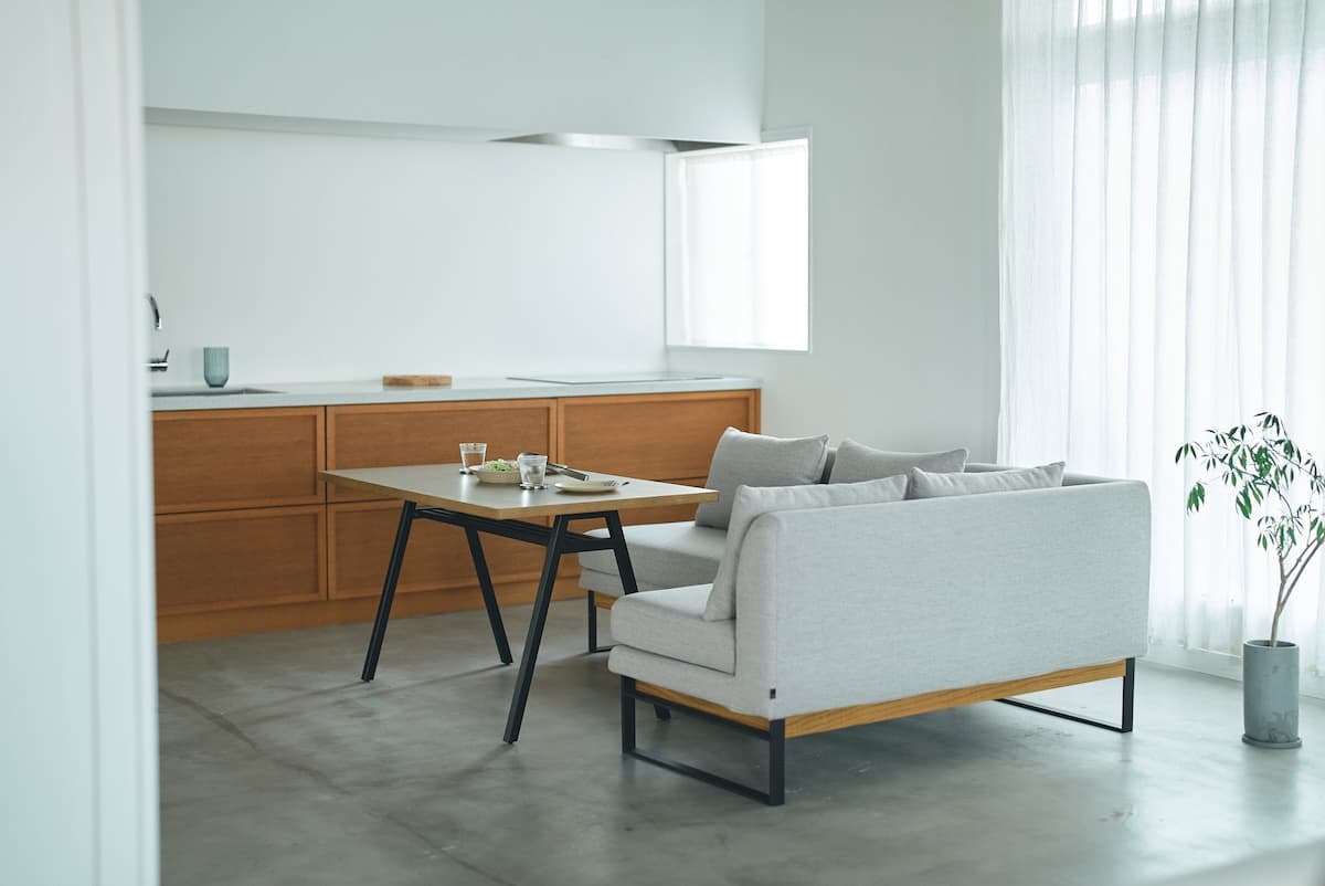 ソファとダイニングを一つの家具にまとめることで、通路が広く取れ、見た目にも広々とした印象になります。