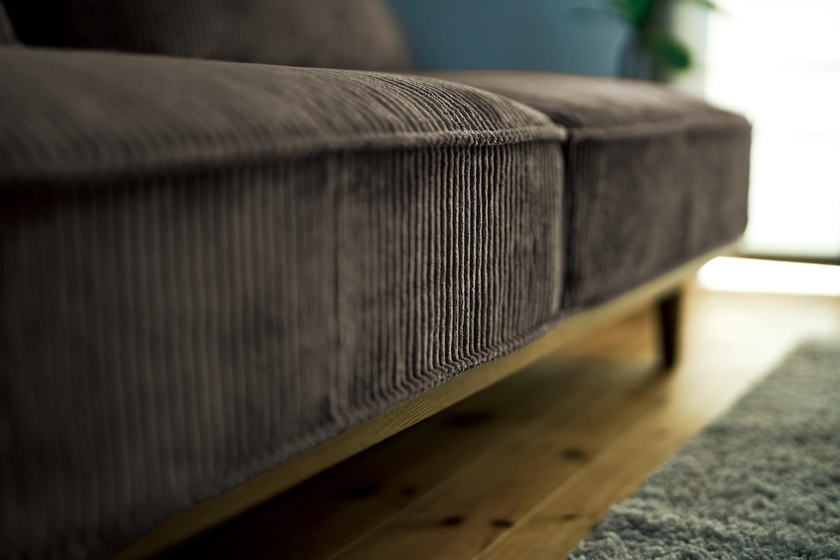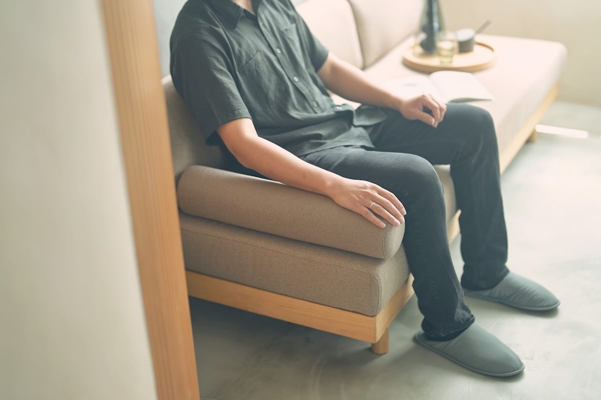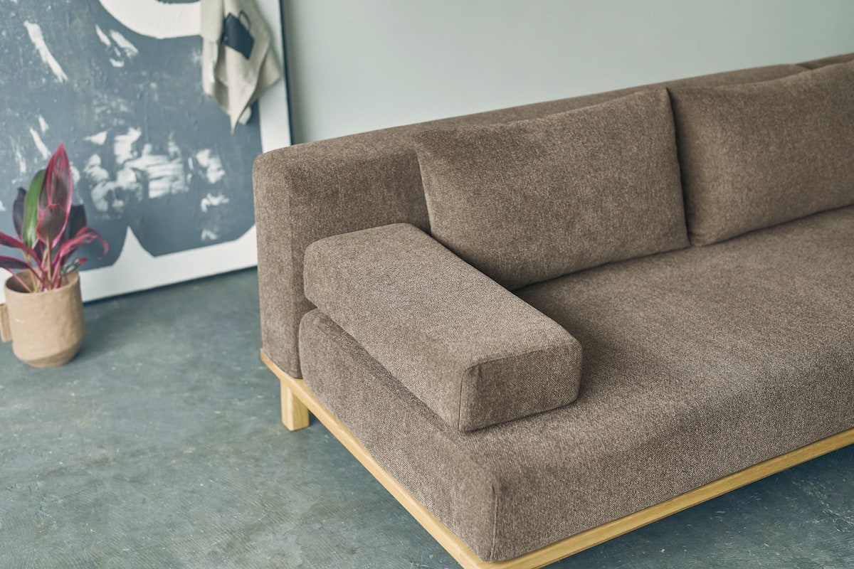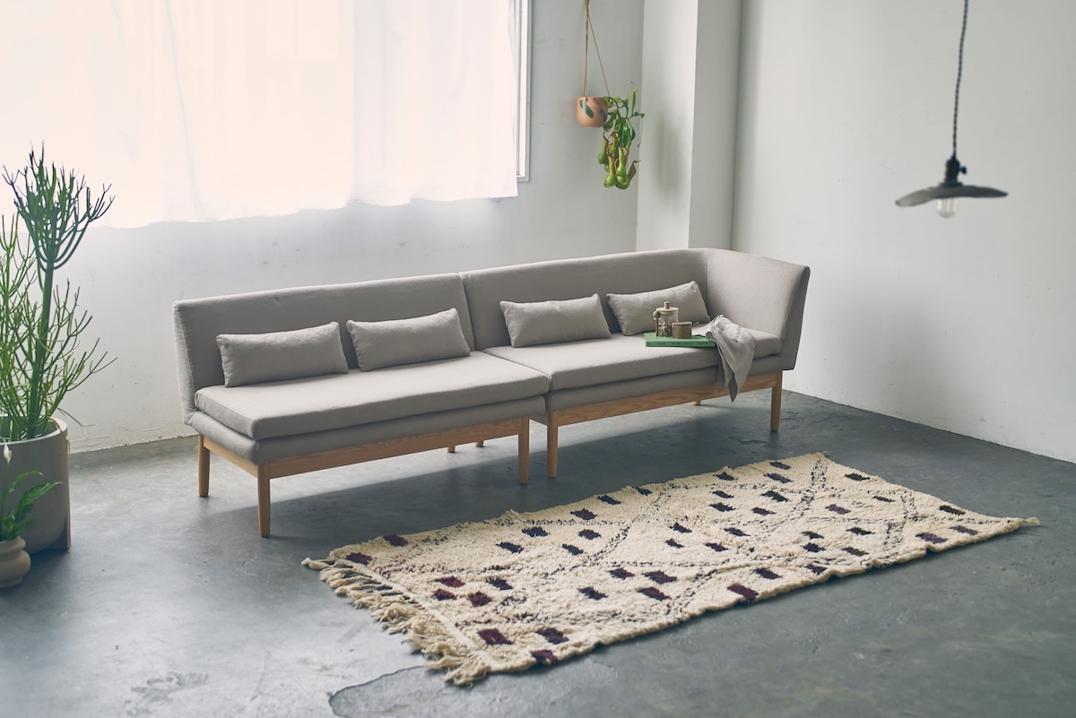 オーク無垢材のフレームと、表情のあるファブリックが、ナチュラルで落ち着いた佇まいを演出。