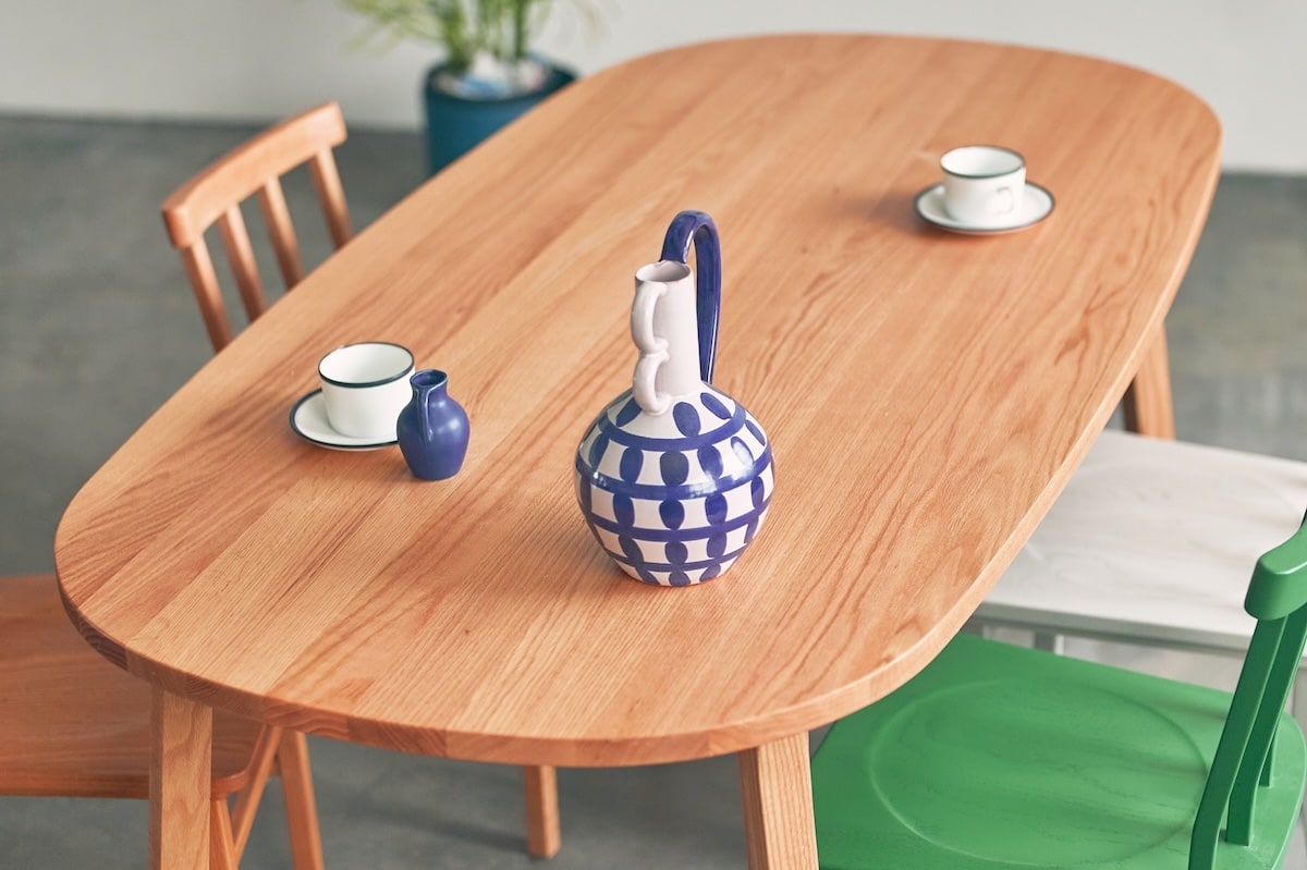 テーブルは、直線的で軽快な脚と、角に丸みを持たせた天板が特徴。長方形タイプに加え、人数や暮らしに合わせて選べる円形テーブルを展開し、少人数からファミリーまで幅広く対応します。