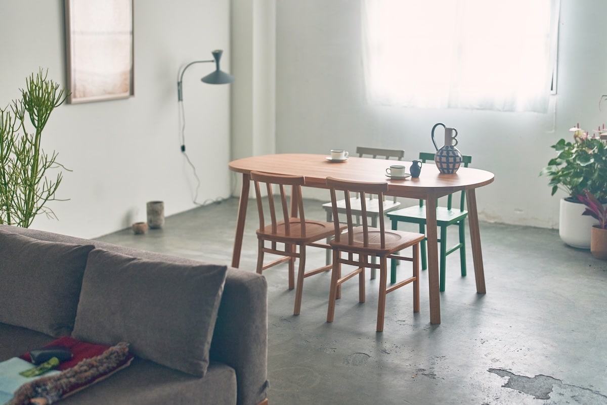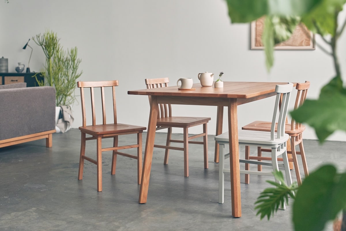 チェアは背のスポーク本数やカラー違いなど、全4タイプをラインナップ。組み合わせ次第で表情が変わり、自分らしいダイニングをつくる楽しさがあります。