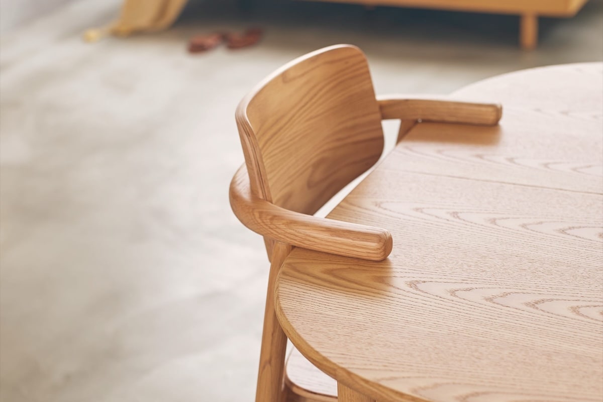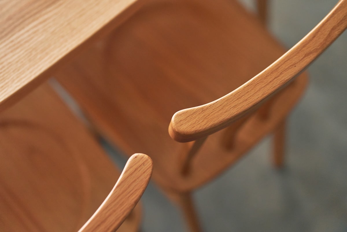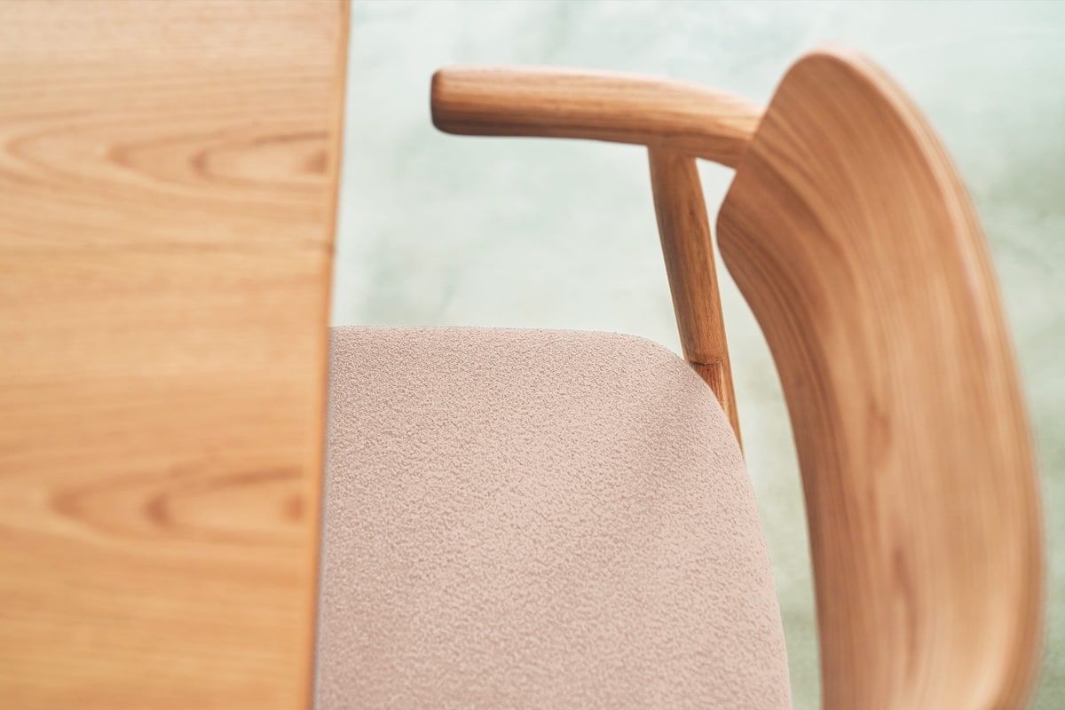 チェアは小さな肘を天板に掛けられる設計で、お掃除や片付けも快適に。カバーリング仕様と板座仕様から選べ、日々の暮らしに合わせた心地よさを叶えます。