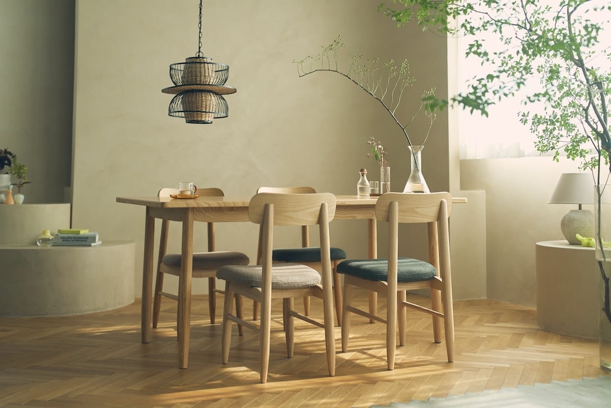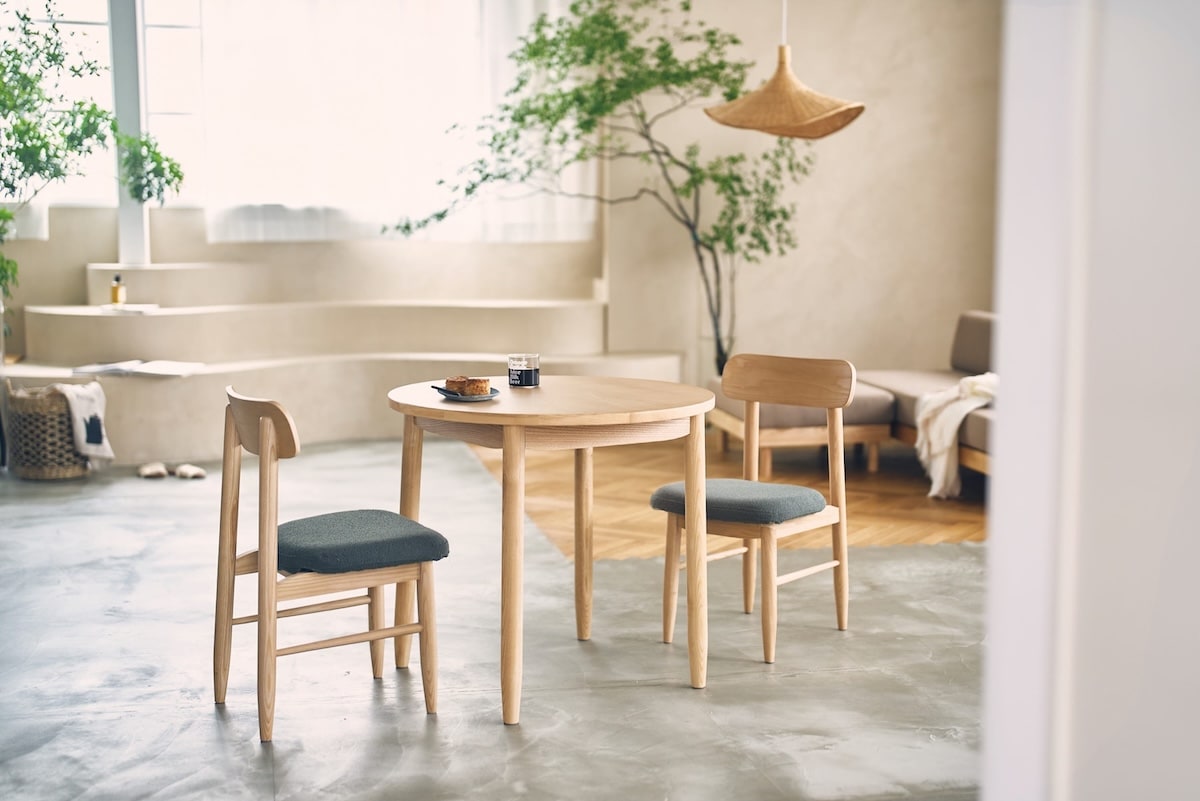 テーブルは用途に応じて選べるサイズ展開で、日常使いから来客時まで対応。チェアはカバーリング仕様で、座面カバーは取り外してクリーニングが可能。生地のリニューアルにより、より幅広い空間に合わせやすくなりました。