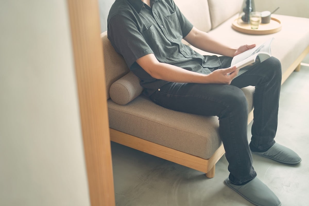 グランドソファは、ゆったりとした奥行きと大きな背クッションが特徴の、くつろぎを主役にしたソファです。広めに設計された座面は、胡坐をかいたり、寝転んだりと、思い思いの姿勢で過ごせる余裕のあるサイズ感。