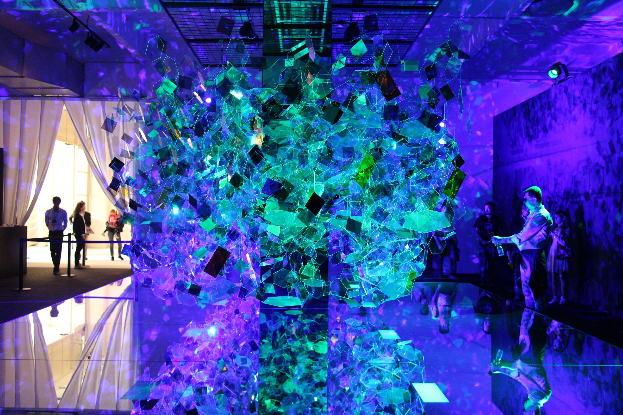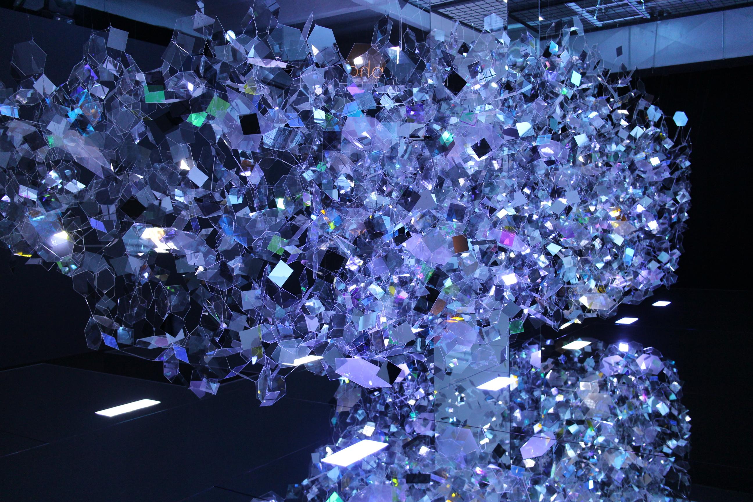 ガラスを用いてガラスの分子構造模型をつくった作品のようです。反射するガラスが神秘的です。
