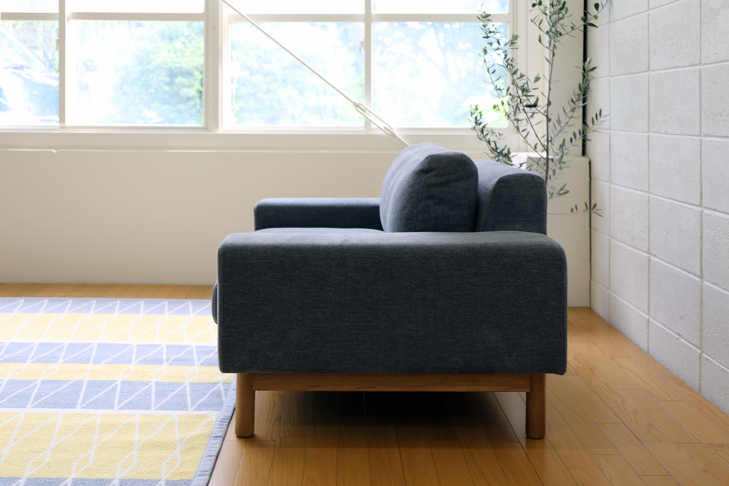 全体的に高さを抑えた、ゆったりとしたソファです。 背や肘にボリュームを持たせ、安定感のある雰囲気を目指しました。