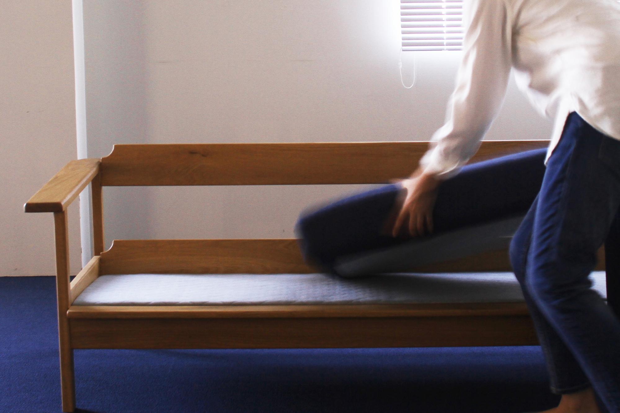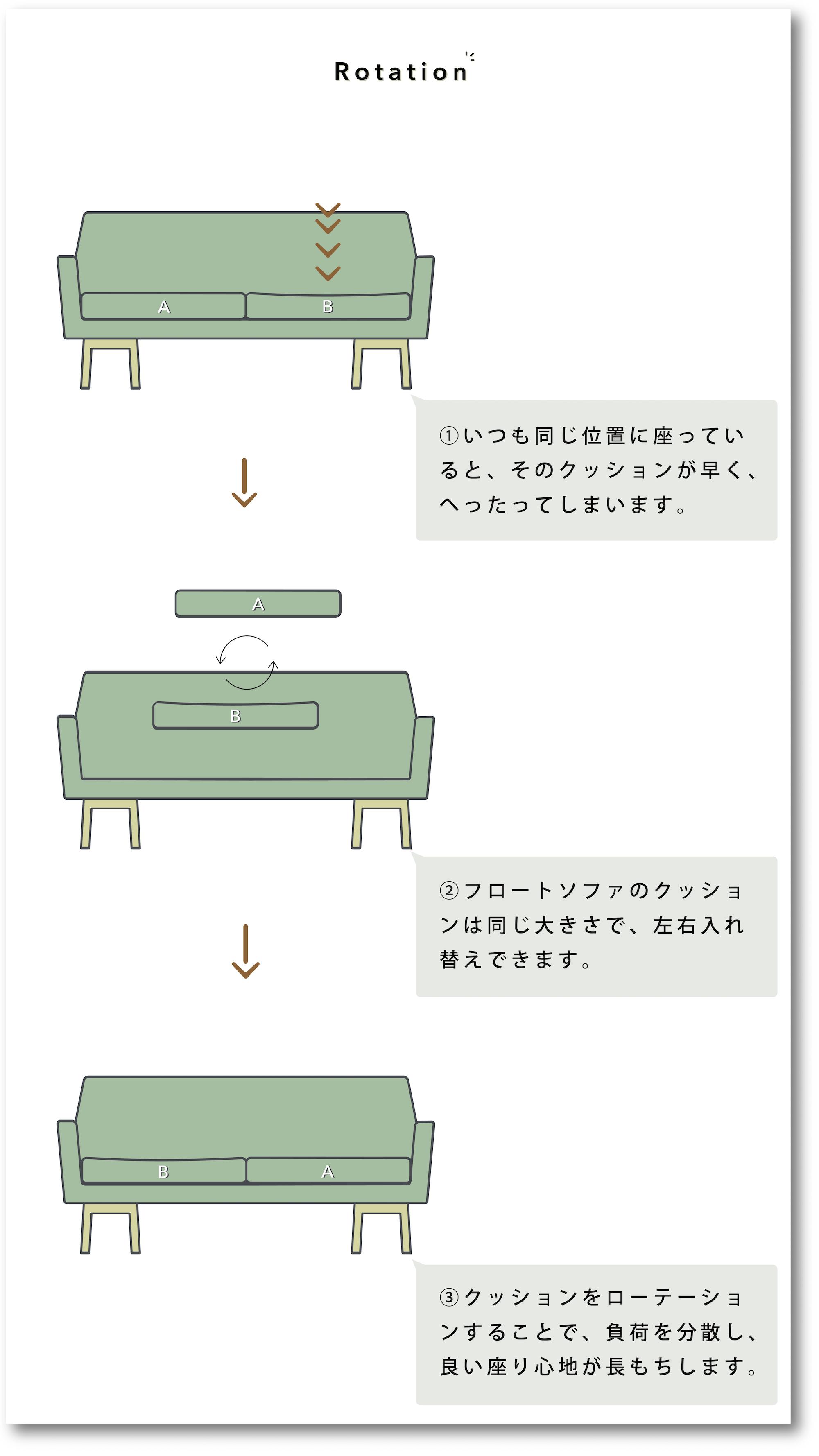 座クッションには、座り心地を良くするため、 ウレタンというスポンジのような素材や、羽毛、綿など、弾力のある素材が多く使われています。ソファに腰掛けると、体重の多くが尾てい骨あたりを中心にかかり、 座クッションには背もたれや肘掛などに比べ大きな負荷がかかります。