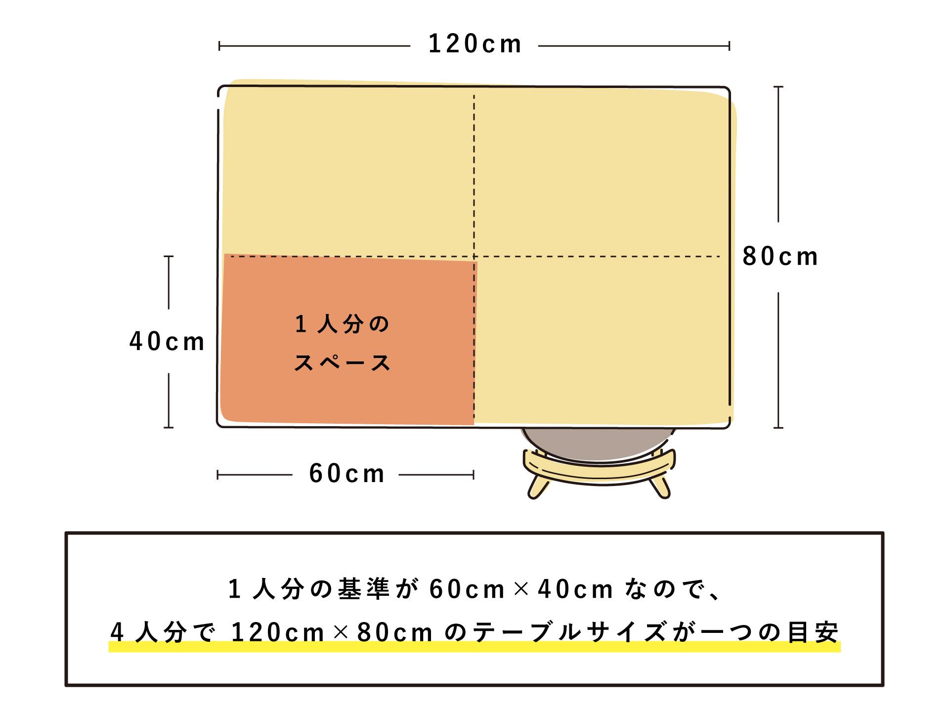 まず、ダイニングテーブルのサイズを選ぶ基準をご説明いたします。テーブルのサイズには、80cm、120cm、135cm、150cm... と様々なサイズがございます。 このサイズを選び方として、1人分の必要スペースで選ぶ基準があります。