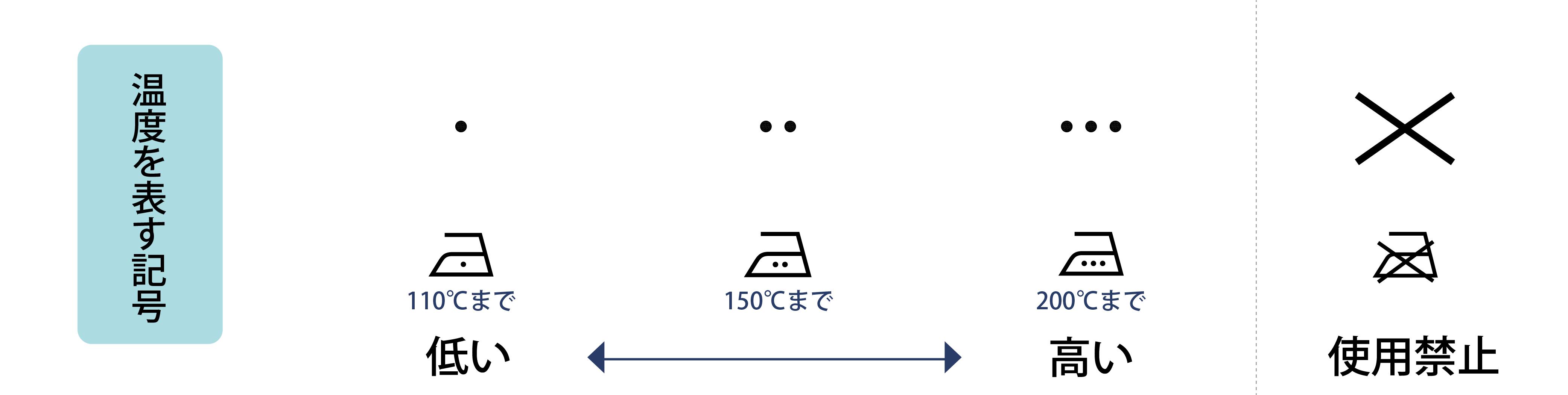 温度を表す記号は2種類ありますが、乾燥機やアイロンなど熱の温度を表す記号は『点』で表し、点の数で温度の高さを表します。点が1つで110℃(低温) 2つで150℃(中温) 3つで200℃(高温)までとなります。