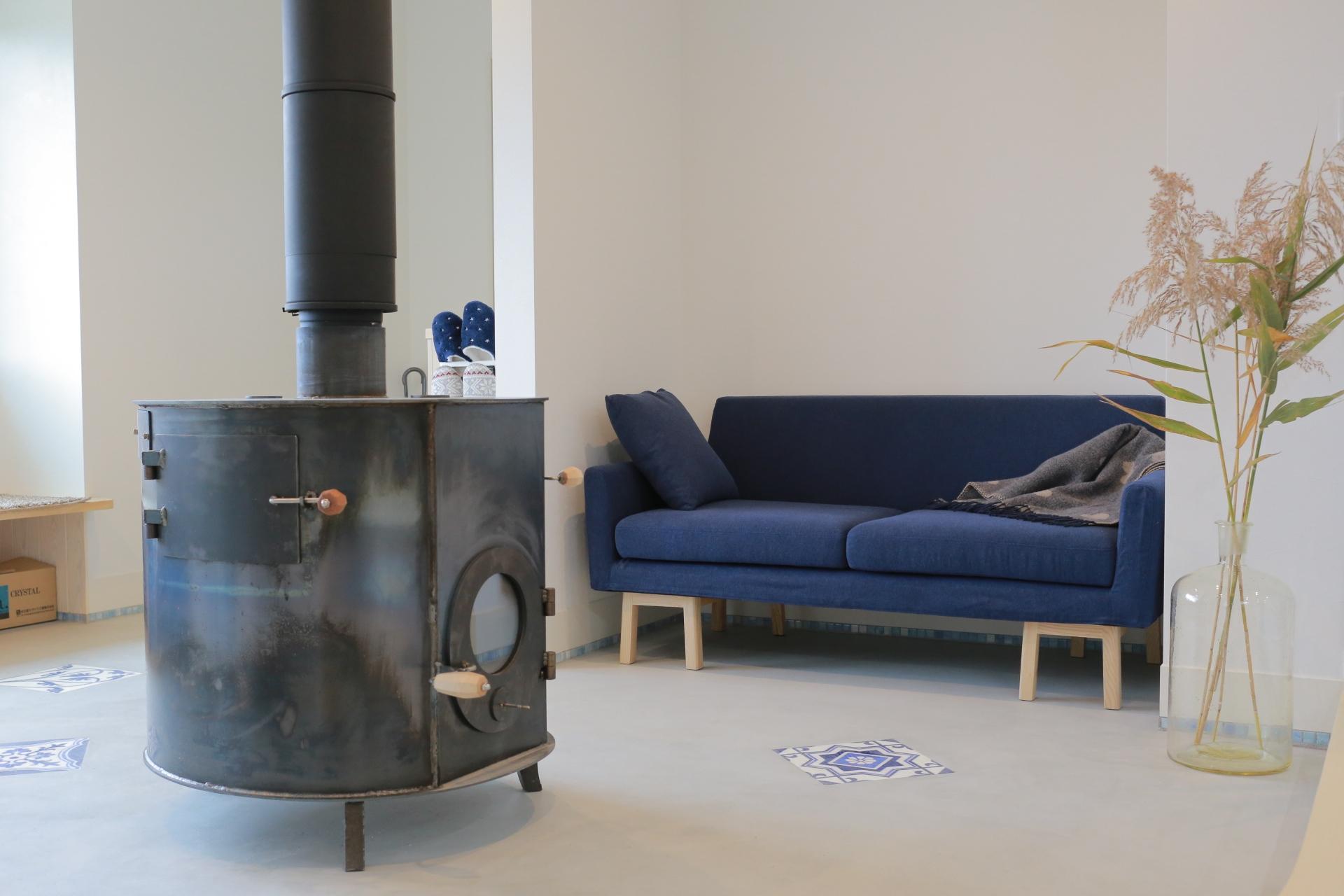 薪ストーブとソファーのある土間リビング
