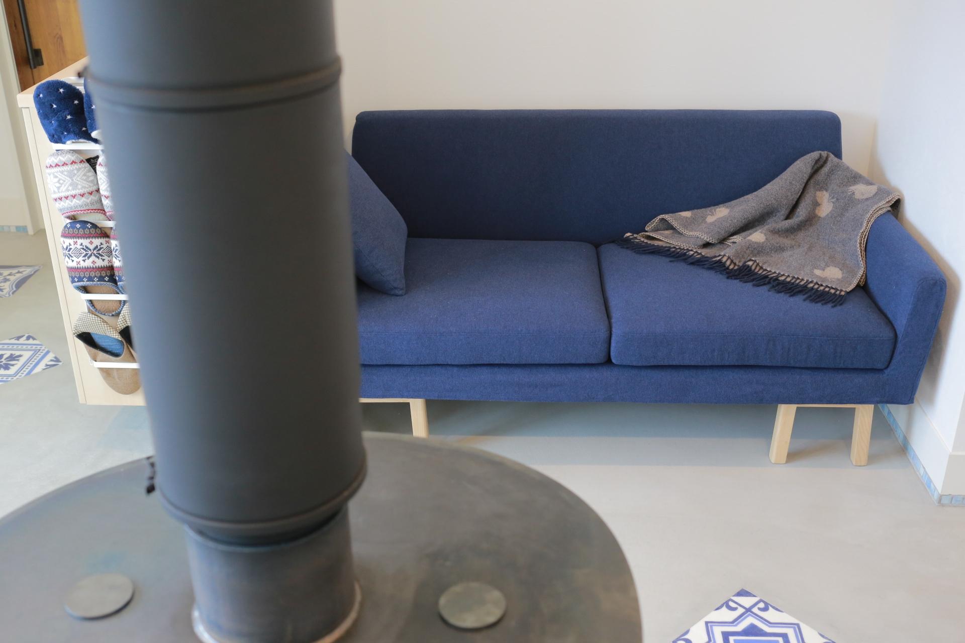 『雪かきや野良仕事の合間に、ほっとひと休みできる空間を目指しました』と、薪ストーブの前に置かれたフロートソファ。