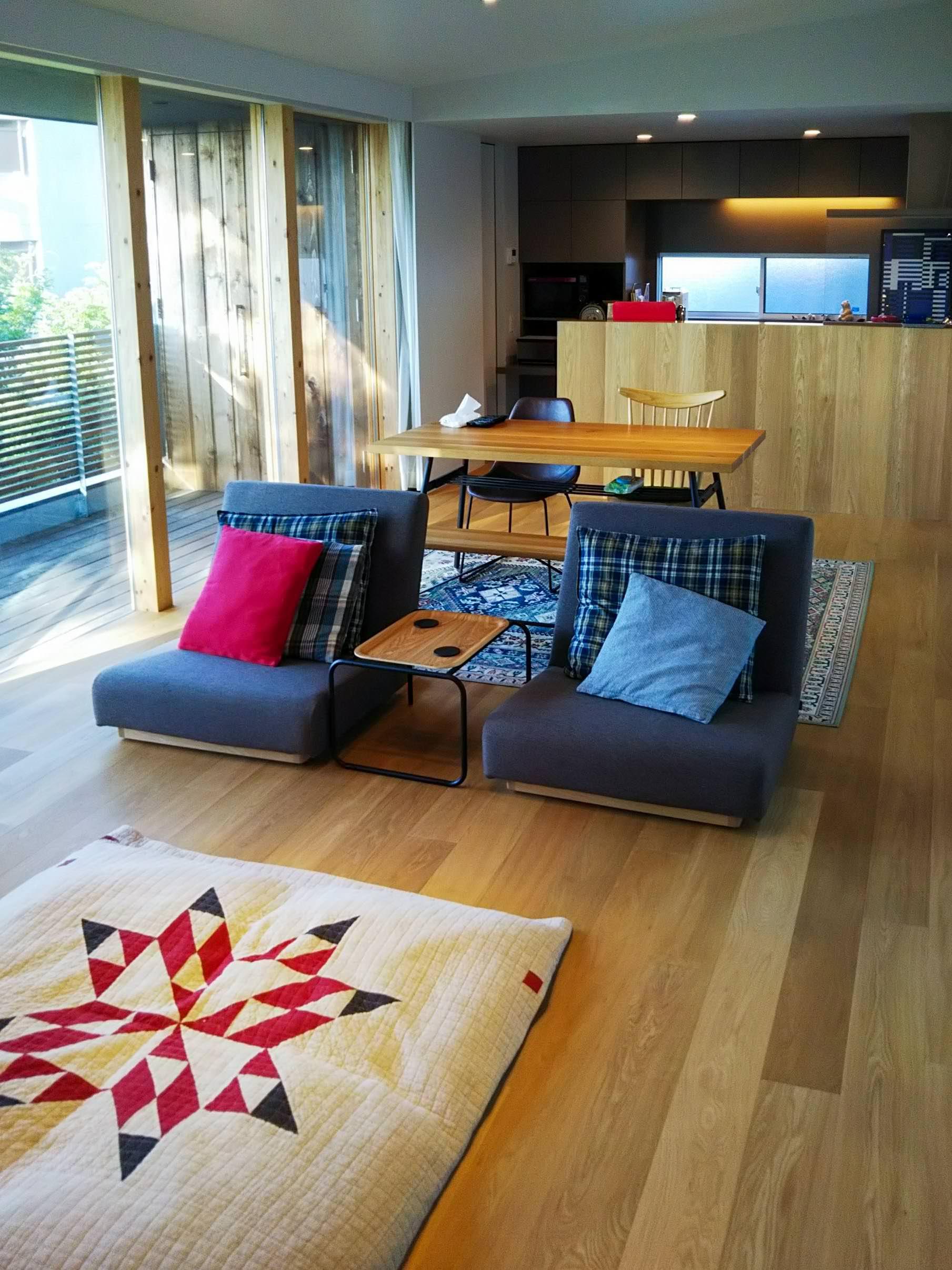 全体のバランスを見てソファの色は2台とも揃え、クッションやラグなど小物でアクセントをつけられています。