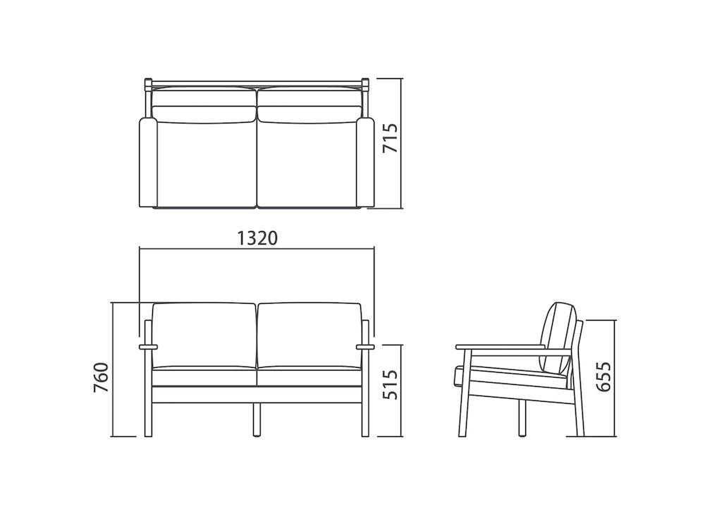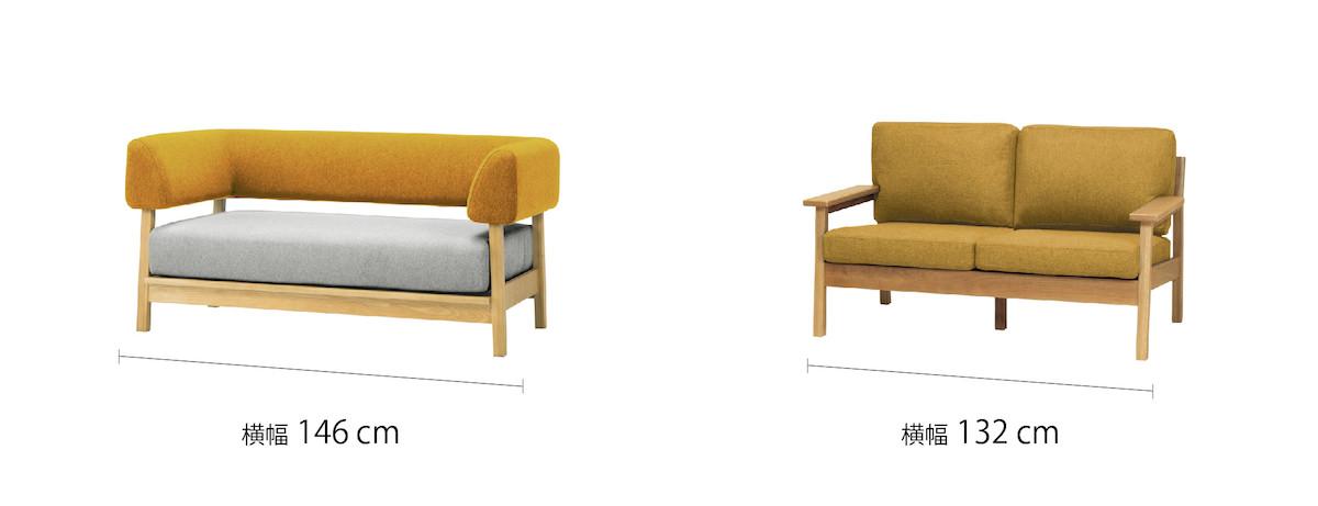 例えば、ブラケットソファ(幅146cm)とマージソファ(幅132 cm)は同じ2人掛けですが、横幅のサイズが 14cm も違います。