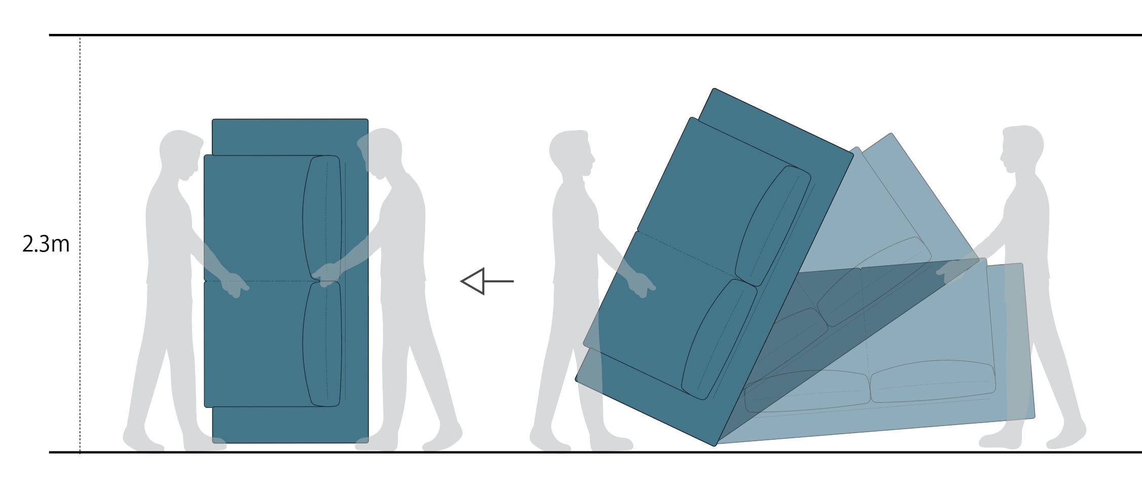 ソファのような大型商品を搬入する場合、横長の状態では通路の曲がり角を通る事が出来ない為、イラストのように立てて運びます。