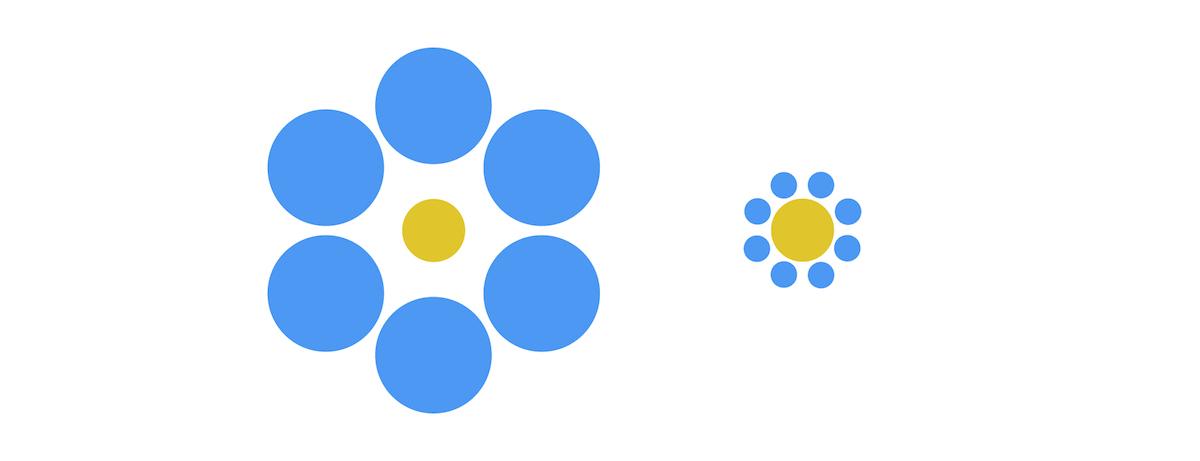 上の二つの絵の『青いマル』の中心にある『黄色のマル』を見て、左側より右側のマルが大きく見えるのではないでしょうか。