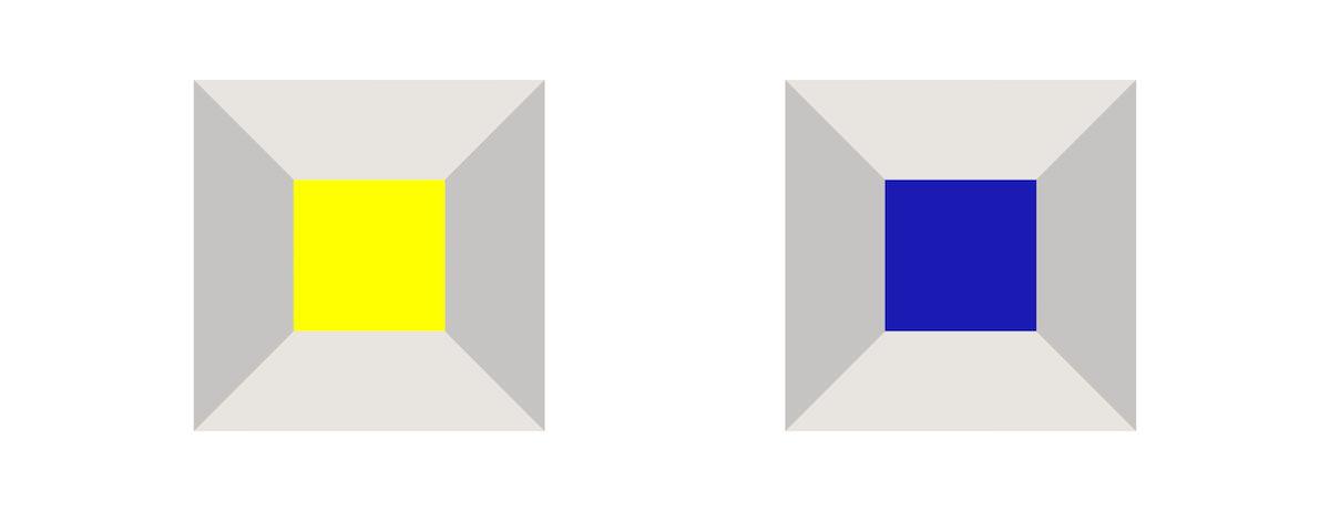 左側の黄色の壁の方が近く感じ、右側の青色の壁は奥に遠ざかっているように見えるのではないでしょうか。