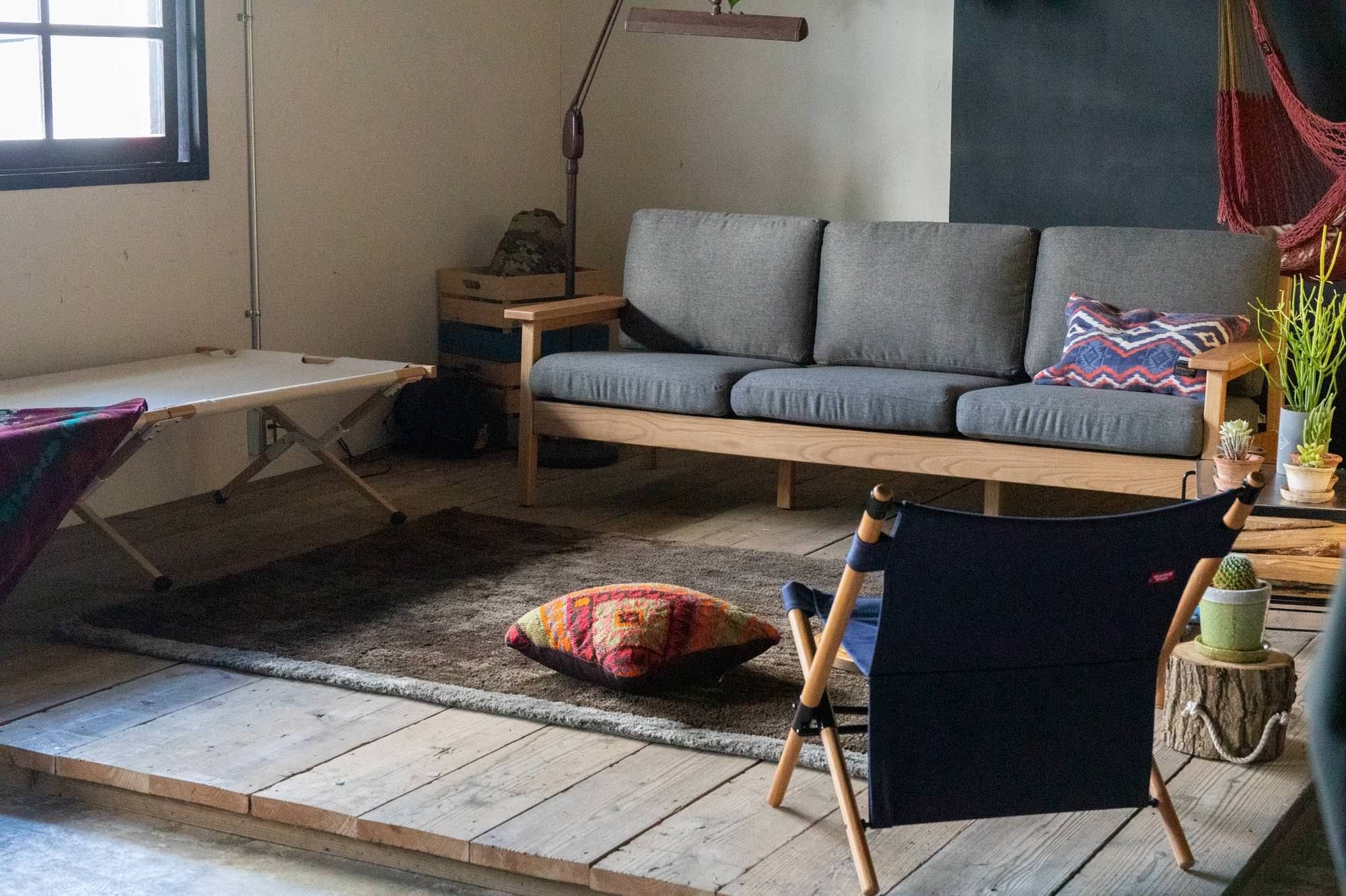 マージ 3人掛けソファをメインに、HangOutのポールローチェアとアペロウッドコット(キャンプで使うベッド兼ベンチ)を組み合わせたリビングをイメージした空間。 メインのソファは座り心地の良い物を選び、サブファニチャーとしてアウトドアギアをセレクト。 アウトドアギアは、使わない時はたたんで収納できるので、部屋を広く使う事ができるのも魅力の一つです。